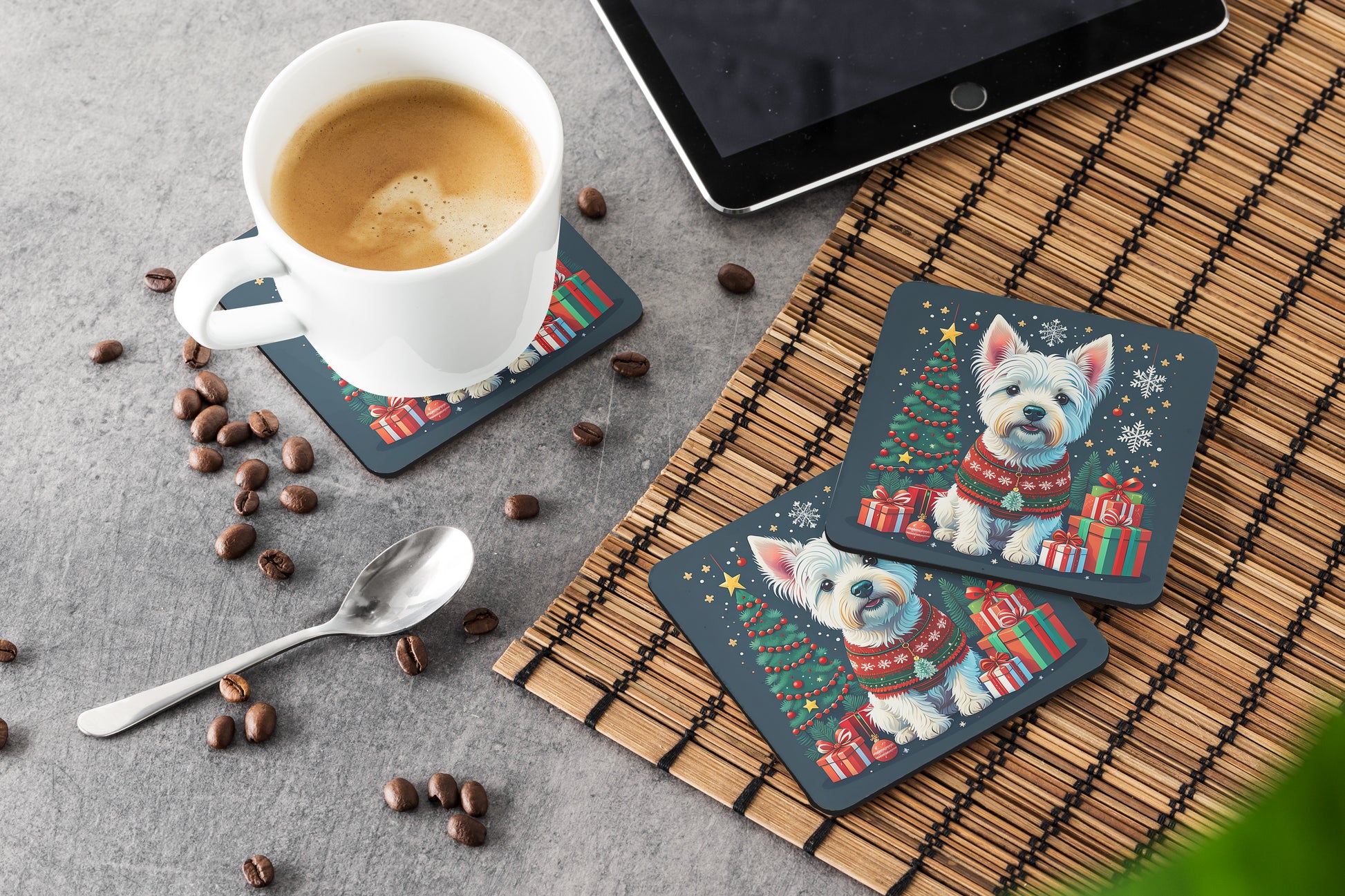 Foam Coasters featuring breed specific West Highland White Terrier artwork. Celebrate Christmas with this Christmas Coaster set. Presenting our Set of 4 Foam Coasters, a stylish and practical addition to your table setting. Each square coaster, measuring 3 1/2 inches by 3 1/2 inches, is perfectly sized to accommodate various drinkware, from coffee mugs to tumblers. These coasters stand out with their full-color artwork, permanently dyed onto the material for a vibrant and fade-resistant finish. They're not just functional, they're a fashionable statement, adding a touch of flair to any gathering or event. Our foam coasters serve a dual purpose - they protect your table from water stains and are perfect for both hot and cold drinks. The material used is similar to that of our high-quality mouse pads, ensuring durability and heat resistance. These coasters are easy to maintain - simply wash them in the top of your dishwasher and lay flat to dry. The design won't come off, ensuring they retain their vivid colors for years. Pair them with one of our insulated coolers or huggers for a cohesive, thoughtful gift set. Enhance your beverage experience with our Set of 4 Foam Coasters.