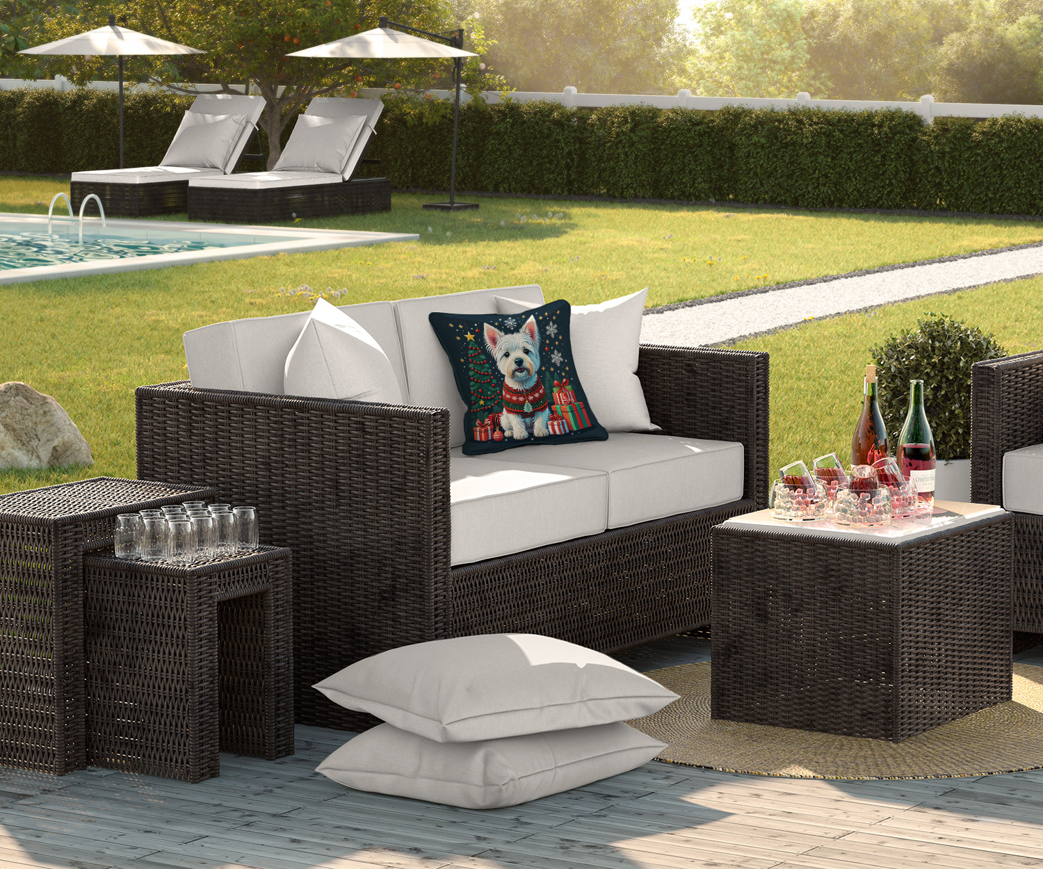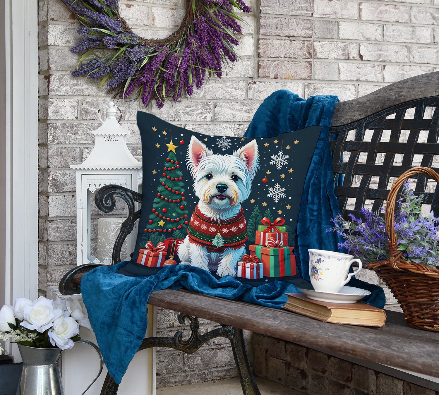 Throw Pillow featuring breed specific West Highland White Terrier artwork. Celebrate Christmas with this Christmas Pillow. Revitalize your outdoor or indoor living space with Caroline's Treasures 18x18 Fabric Decorative Pillow. With a generously sized dimension of approximately 18 inches by 18 inches, this pillow makes a comfortable and aesthetic addition to any seating area. Made from a unique, water-resistant material developed by Caroline's Treasures, the pillow sham is 100% polyester fabric that's durable and ready to weather any condition. Its vibrant, full-color artwork will not fade over time as it is dyed with color-fast dyes. Whether you place it on your patio furniture, porch, veranda, or indoor couch, its soft canvas fabric ensures a cozy experience. The pillow is handcrafted in the United States, featuring a sham created from three pieces of fabric and a polyester insert for enduring shape and overstuffed comfort. Despite being robustly built to endure the outdoors, it is as soft and snug as your favorite indoor cushions. Please note, as all our pillows are handmade, sizes may vary slightly, adding to the charm of this unique decorative item.