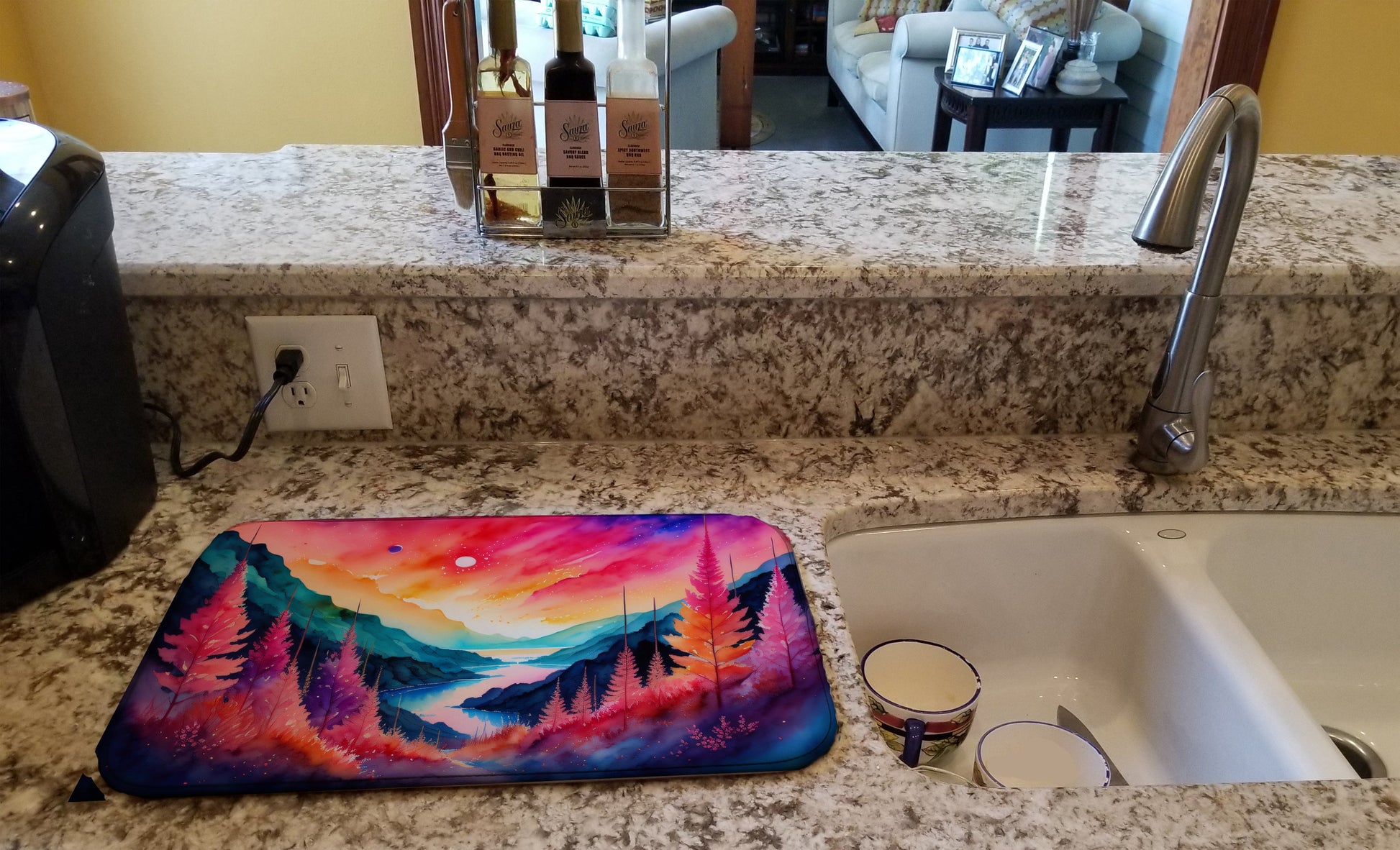 Say goodbye to messy countertops and soggy dish towels with our innovative dish drying mat. Our high-quality dish drying pad is designed to keep your countertops dry while offering a stylish and efficient solution. Whether you're air drying dishes, glasses, stemware, silverware, pots, pans, bottles, or even fruits and vegetables, our dish mat is the perfect choice. The 14 inches x 22 inches size fits most counters and dish drying racks, and the non-slip design ensures stability. Made with water-absorbent polyester and a polyurethane foam insert, our dish drying mat is not only functional but also durable. It's machine washable and printed in the USA for long-lasting use. The beautiful artwork adds flair to your kitchen decor, making it a perfect housewarming gift or present for any occasion. Upgrade your kitchen experience with our absorbent and versatile dish drying mat.
