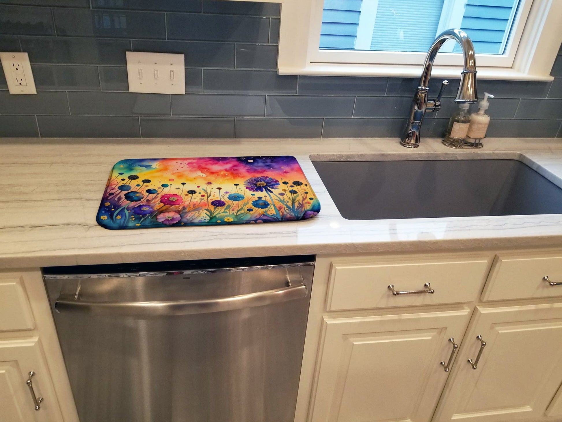 Say goodbye to messy countertops and soggy dish towels with our innovative dish drying mat. Our high-quality dish drying pad is designed to keep your countertops dry while offering a stylish and efficient solution. Whether you're air drying dishes, glasses, stemware, silverware, pots, pans, bottles, or even fruits and vegetables, our dish mat is the perfect choice. The 14 inches x 22 inches size fits most counters and dish drying racks, and the non-slip design ensures stability. Made with water-absorbent polyester and a polyurethane foam insert, our dish drying mat is not only functional but also durable. It's machine washable and printed in the USA for long-lasting use. The beautiful artwork adds flair to your kitchen decor, making it a perfect housewarming gift or present for any occasion. Upgrade your kitchen experience with our absorbent and versatile dish drying mat.
