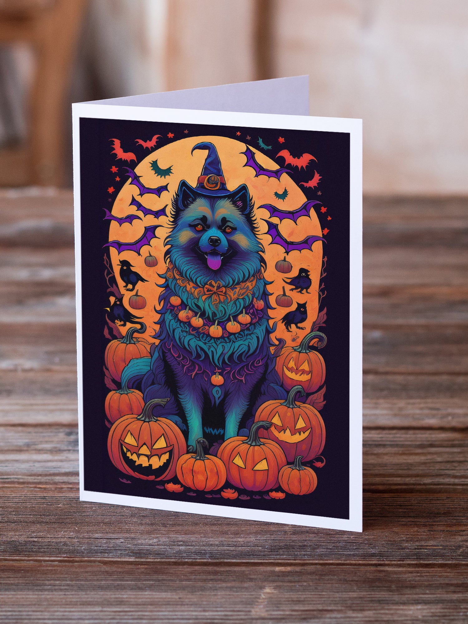 Greeting Cards and Envelopes Pack of 8 featuring breed specific Keeshond artwork. Celebrate Halloween with this Halloween . Celebrate special moments with Caroline's Treasures Printed Greeting Card Pack. This pack includes eight beautifully folded 5x7 cards, accompanied by eight matching white envelopes. With blank interiors, these cards provide ample space for your personalized messages and heartfelt holiday greetings. Each card features captivating full-color artwork, meticulously printed in our facility on high-quality 80 lb cover stock or 216 GSM. The super smooth finish of the white cards enhances the visual impact of the artwork, creating a truly stunning presentation. Designed by our talented in-house artists or licensed artists, the artwork on these cards showcases their creativity and attention to detail. From vibrant illustrations to captivating designs, each card tells its own unique story. Whether it's for birthdays, anniversaries, holidays, or any special occasion, Caroline's Treasures Greeting Card Pack is the perfect way to convey your heartfelt sentiments. Share joy, love, and warm wishes with these exquisite cards and make every moment unforgettable.