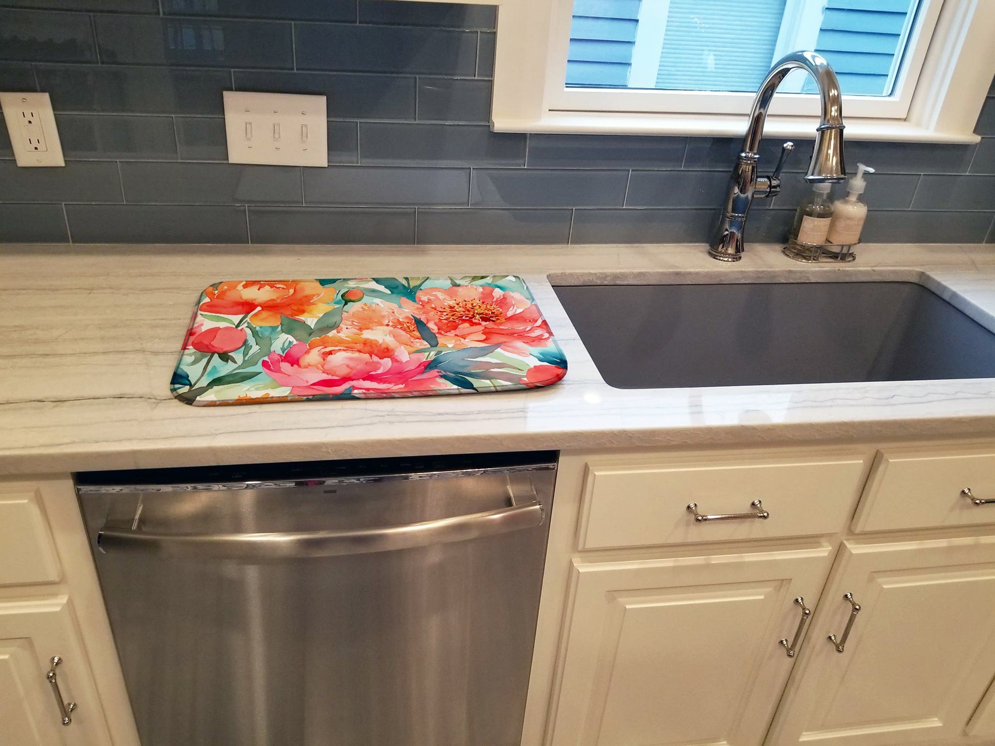 Dish Drying Mat featuring breed specific Peonies artwork. Say goodbye to messy countertops and soggy dish towels with our innovative dish drying mat. Our high-quality dish drying pad is designed to keep your countertops dry while offering a stylish and efficient solution. Whether you're air drying dishes, glasses, stemware, silverware, pots, pans, bottles, or even fruits and vegetables, our dish mat is the perfect choice. The 14 inches x 22 inches size fits most counters and dish drying racks, and the non-slip design ensures stability. Made with water-absorbent polyester and a polyurethane foam insert, our dish drying mat is not only functional but also durable. It's machine washable and printed in the USA for long-lasting use. The beautiful artwork adds flair to your kitchen decor, making it a perfect housewarming gift or present for any occasion. Upgrade your kitchen experience with our absorbent and versatile dish drying mat.