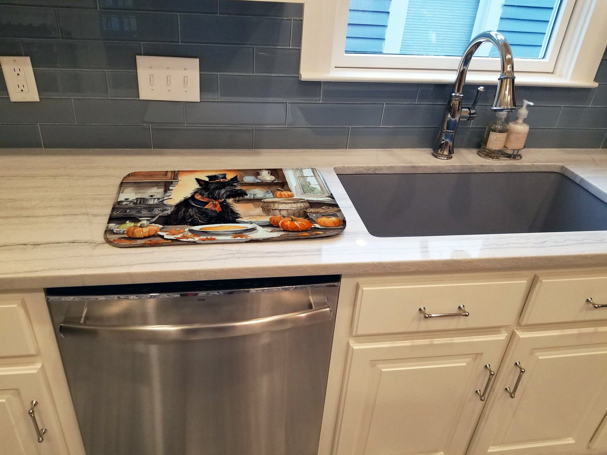 Dish Drying Mat featuring breed specific Scottish Terrier artwork. Celebrate Halloween with this Halloween Dish Drying Mat. Say goodbye to messy countertops and soggy dish towels with our innovative dish drying mat. Our high-quality dish drying pad is designed to keep your countertops dry while offering a stylish and efficient solution. Whether you're air drying dishes, glasses, stemware, silverware, pots, pans, bottles, or even fruits and vegetables, our dish mat is the perfect choice. The 14 inches x 22 inches size fits most counters and dish drying racks, and the non-slip design ensures stability. Made with water-absorbent polyester and a polyurethane foam insert, our dish drying mat is not only functional but also durable. It's machine washable and printed in the USA for long-lasting use. The beautiful artwork adds flair to your kitchen decor, making it a perfect housewarming gift or present for any occasion. Upgrade your kitchen experience with our absorbent and versatile dish drying mat.