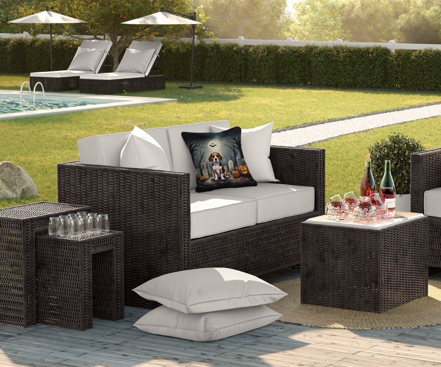 Throw Pillow featuring breed specific Beagle artwork. Celebrate Halloween with this Halloween Pillow. Revitalize your outdoor or indoor living space with Caroline's Treasures 18x18 Fabric Decorative Pillow. With a generously sized dimension of approximately 18 inches by 18 inches, this pillow makes a comfortable and aesthetic addition to any seating area. Made from a unique, water-resistant material developed by Caroline's Treasures, the pillow sham is 100% polyester fabric that's durable and ready to weather any condition. Its vibrant, full-color artwork will not fade over time as it is dyed with color-fast dyes. Whether you place it on your patio furniture, porch, veranda, or indoor couch, its soft canvas fabric ensures a cozy experience. The pillow is handcrafted in the United States, featuring a sham created from three pieces of fabric and a polyester insert for enduring shape and overstuffed comfort. Despite being robustly built to endure the outdoors, it is as soft and snug as your favorite indoor cushions. Please note, as all our pillows are handmade, sizes may vary slightly, adding to the charm of this unique decorative item.