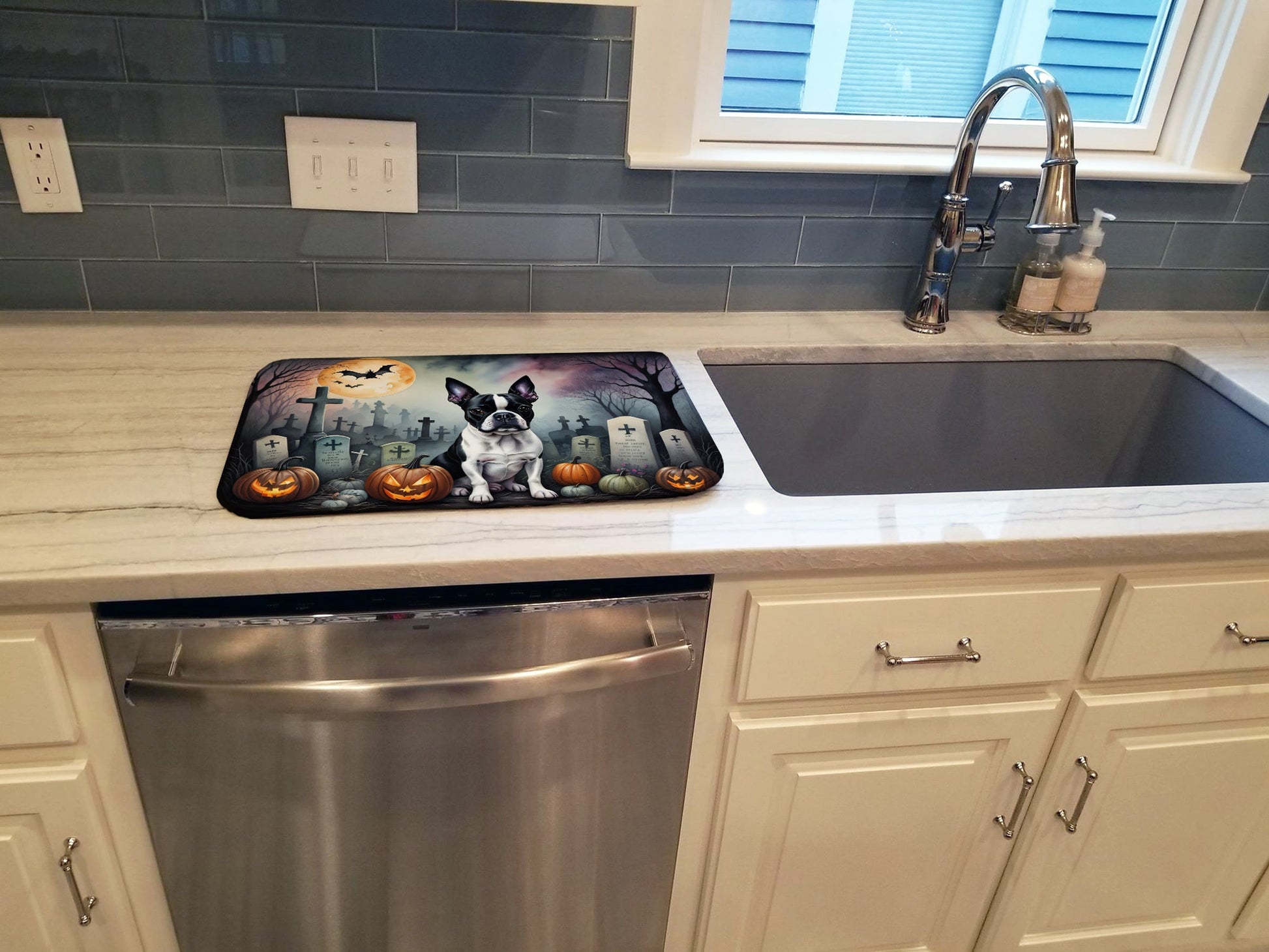 Boston Terrier Spooky Halloween Dish Drying Mat