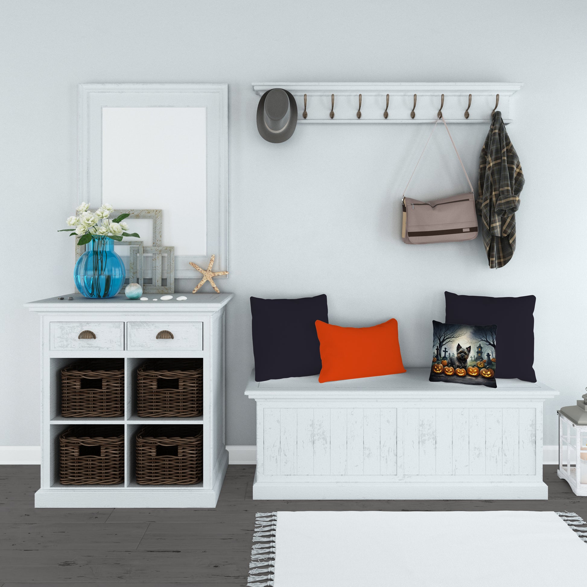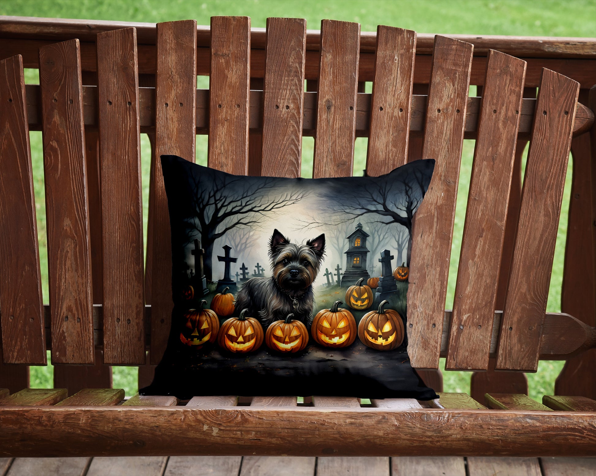 Throw Pillow featuring breed specific Cairn Terrier artwork. Celebrate Halloween with this Halloween Pillow. Add a touch of vibrancy and comfort to your outdoor seating with Caroline's Treasures Fabric Decorative Pillow. Measuring approximately 14 inches by 14 inches, this outdoor pillow is crafted to elevate the appeal of your patio furniture, infusing it with vivid color and artistic flair. The pillow includes a 100% Polyester Fabric sham filled with a quality pillow form to provide superior comfort. Innovatively made from our brand new material, specifically woven for its water resistance, this pillow is designed for durability. The soft canvas fabric offers versatility in use, fit for your indoor couch or your outdoor patio, porch, or veranda. The fabric is dyed with colorfast dyes built for resilience against weather conditions, ensuring the pillow retains its beauty over time. Constructed by sewing three fabric pieces to create a sham, the polyester insert is then nestled inside to form the pillow, resulting in an overstuffed pillow that maintains its shape. Both the sham and the pillow insert are proudly made in the United States. As the pillows are handcrafted, there may be minor variations in size, further enhancing their unique charm. Experience comfort in style with Caroline's Treasures Fabric Decorative Pillow.