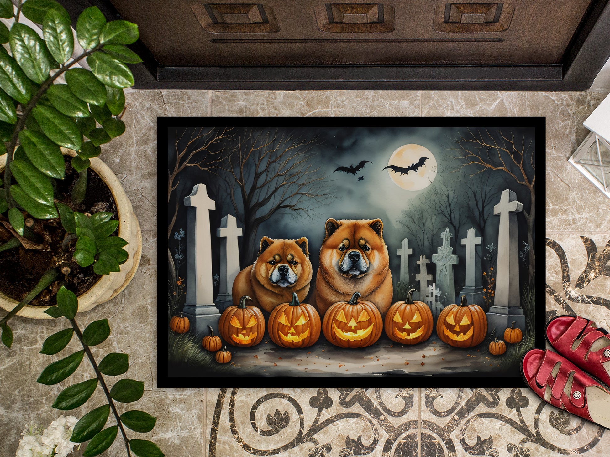 Doormat featuring breed specific Chow Chow artwork. Celebrate Halloween with this Halloween Doormat. Welcome your guests in style with our Artwork Door Mat, designed to withstand almost any weather condition. This mat, measuring approximately 18 by 27 inches, is held together by durable black binding tape. Its top layer, composed of polyester felt, is dyed with the eye-catching image you see on the mat. A few layers below provide the mat with stability, while its rubber bottom is stamped to help prevent slipping and ensures safety. Our mat works wonderfully as both an indoor or outdoor door mat. For cleaning, simply hose it off with water or use a power washer - no need for any cleaner that produces suds. Avoid scrubbing with a brush, instead, opt for the vacuum on floor setting. Designed manufactured and printed in the USA, this mat is a perfect addition to your porch, outdoor kitchen, entryway, or any indoor space. Its unique design makes it a charming decorative rug that greets your guests and adds a stylish touch to your home decor.