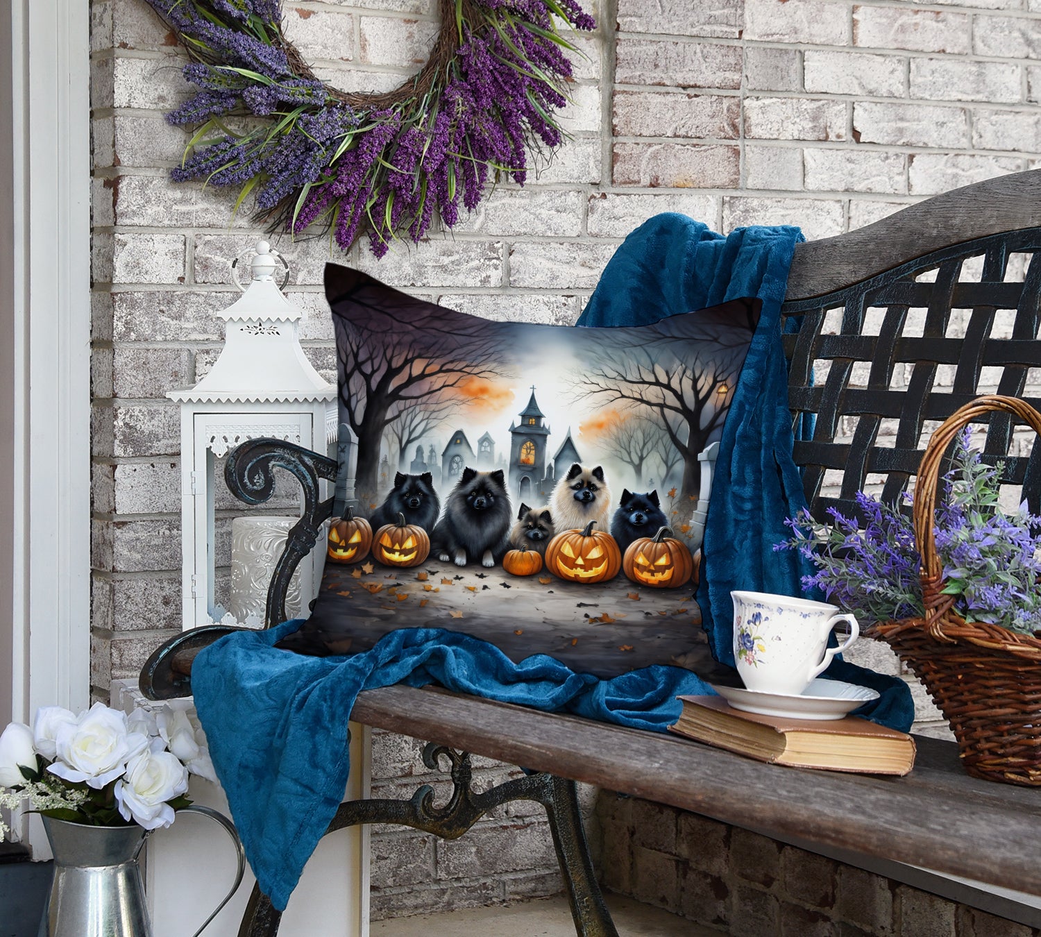 Throw Pillow featuring breed specific Keeshond artwork. Celebrate Halloween with this Halloween Pillow. Revitalize your outdoor or indoor living space with Caroline's Treasures 18x18 Fabric Decorative Pillow. With a generously sized dimension of approximately 18 inches by 18 inches, this pillow makes a comfortable and aesthetic addition to any seating area. Made from a unique, water-resistant material developed by Caroline's Treasures, the pillow sham is 100% polyester fabric that's durable and ready to weather any condition. Its vibrant, full-color artwork will not fade over time as it is dyed with color-fast dyes. Whether you place it on your patio furniture, porch, veranda, or indoor couch, its soft canvas fabric ensures a cozy experience. The pillow is handcrafted in the United States, featuring a sham created from three pieces of fabric and a polyester insert for enduring shape and overstuffed comfort. Despite being robustly built to endure the outdoors, it is as soft and snug as your favorite indoor cushions. Please note, as all our pillows are handmade, sizes may vary slightly, adding to the charm of this unique decorative item.