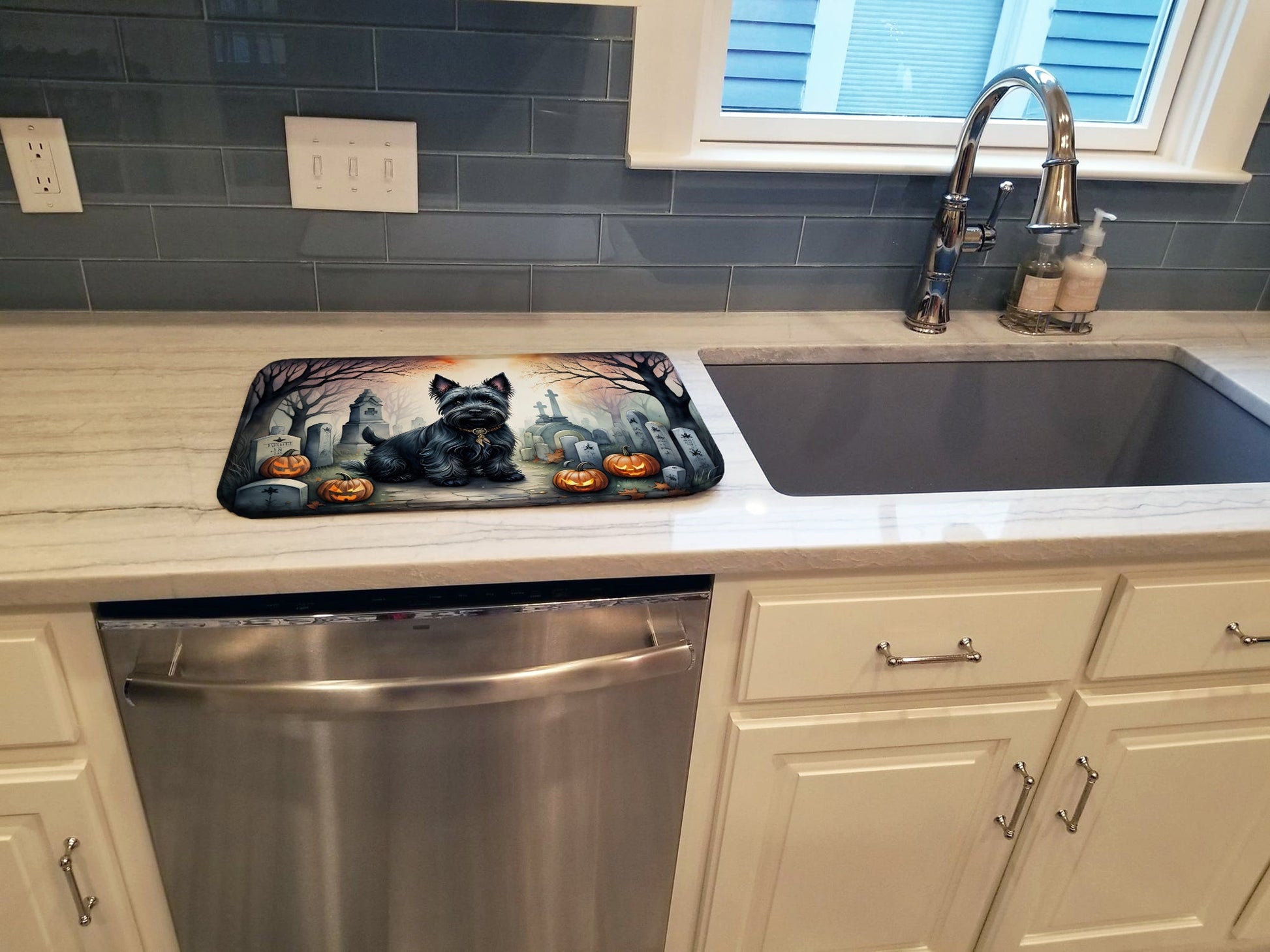 Dish Drying Mat featuring breed specific Scottish Terrier artwork. Celebrate Halloween with this Halloween Dish Drying Mat. Say goodbye to messy countertops and soggy dish towels with our innovative dish drying mat. Our high-quality dish drying pad is designed to keep your countertops dry while offering a stylish and efficient solution. Whether you're air drying dishes, glasses, stemware, silverware, pots, pans, bottles, or even fruits and vegetables, our dish mat is the perfect choice. The 14 inches x 22 inches size fits most counters and dish drying racks, and the non-slip design ensures stability. Made with water-absorbent polyester and a polyurethane foam insert, our dish drying mat is not only functional but also durable. It's machine washable and printed in the USA for long-lasting use. The beautiful artwork adds flair to your kitchen decor, making it a perfect housewarming gift or present for any occasion. Upgrade your kitchen experience with our absorbent and versatile dish drying mat.