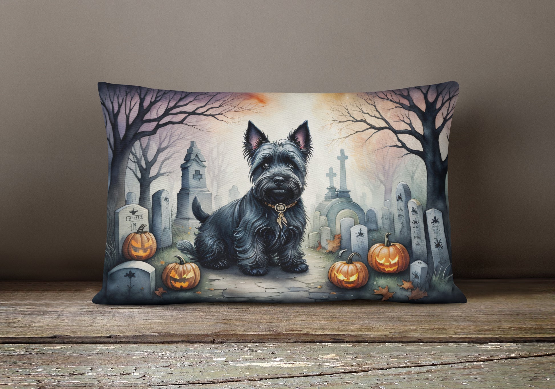 Throw Pillow featuring breed specific Scottish Terrier artwork. Celebrate Halloween with this Halloween Pillow. Embrace the fusion of comfort and style with Caroline's Treasures Fabric Decorative Pillow. This 12x16 inch outdoor pillow is designed to complement your patio furniture, adding a splash of color and artistry to your outdoor setting. Constructed with a 100% Polyester Fabric pillow sham filled with a plush pillow form, this cushion is as comfortable as it is durable. Our outdoor pillow utilizes a novel fabric, meticulously woven for enhanced water resistance. This soft canvas material is equally suited for your indoor couch as well as outdoor settings such as the patio, porch, or veranda. To ensure enduring vibrance, we employ colorfast dyes resistant to fading even when subjected to weather elements. The making of this pillow involves the delicate sewing together of three fabric pieces to create a sham, into which a polyester insert is carefully placed. The result is an overstuffed pillow that tenaciously holds its shape. With both the sham and the pillow insert crafted in the United States, these handmade pillows are a testament to superior local craftsmanship. Note that as these pillows are handmade, sizes may slightly vary, enhancing their unique appeal. Enjoy comfort in style with Caroline's Treasures Fabric Decorative Pillow.