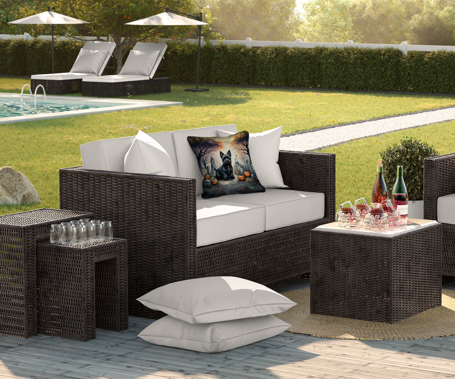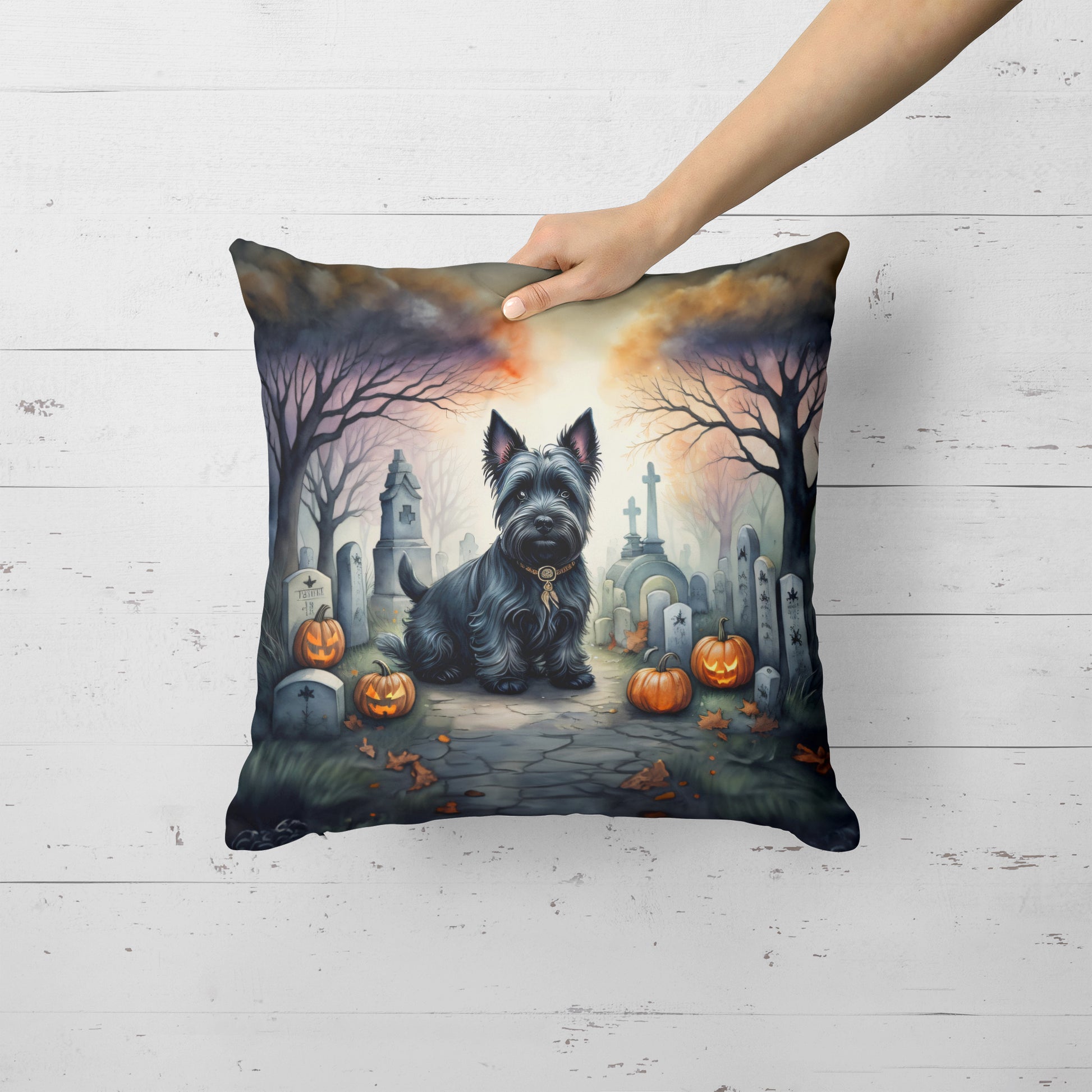 Throw Pillow featuring breed specific Scottish Terrier artwork. Celebrate Halloween with this Halloween Pillow. Revitalize your outdoor or indoor living space with Caroline's Treasures 18x18 Fabric Decorative Pillow. With a generously sized dimension of approximately 18 inches by 18 inches, this pillow makes a comfortable and aesthetic addition to any seating area. Made from a unique, water-resistant material developed by Caroline's Treasures, the pillow sham is 100% polyester fabric that's durable and ready to weather any condition. Its vibrant, full-color artwork will not fade over time as it is dyed with color-fast dyes. Whether you place it on your patio furniture, porch, veranda, or indoor couch, its soft canvas fabric ensures a cozy experience. The pillow is handcrafted in the United States, featuring a sham created from three pieces of fabric and a polyester insert for enduring shape and overstuffed comfort. Despite being robustly built to endure the outdoors, it is as soft and snug as your favorite indoor cushions. Please note, as all our pillows are handmade, sizes may vary slightly, adding to the charm of this unique decorative item.