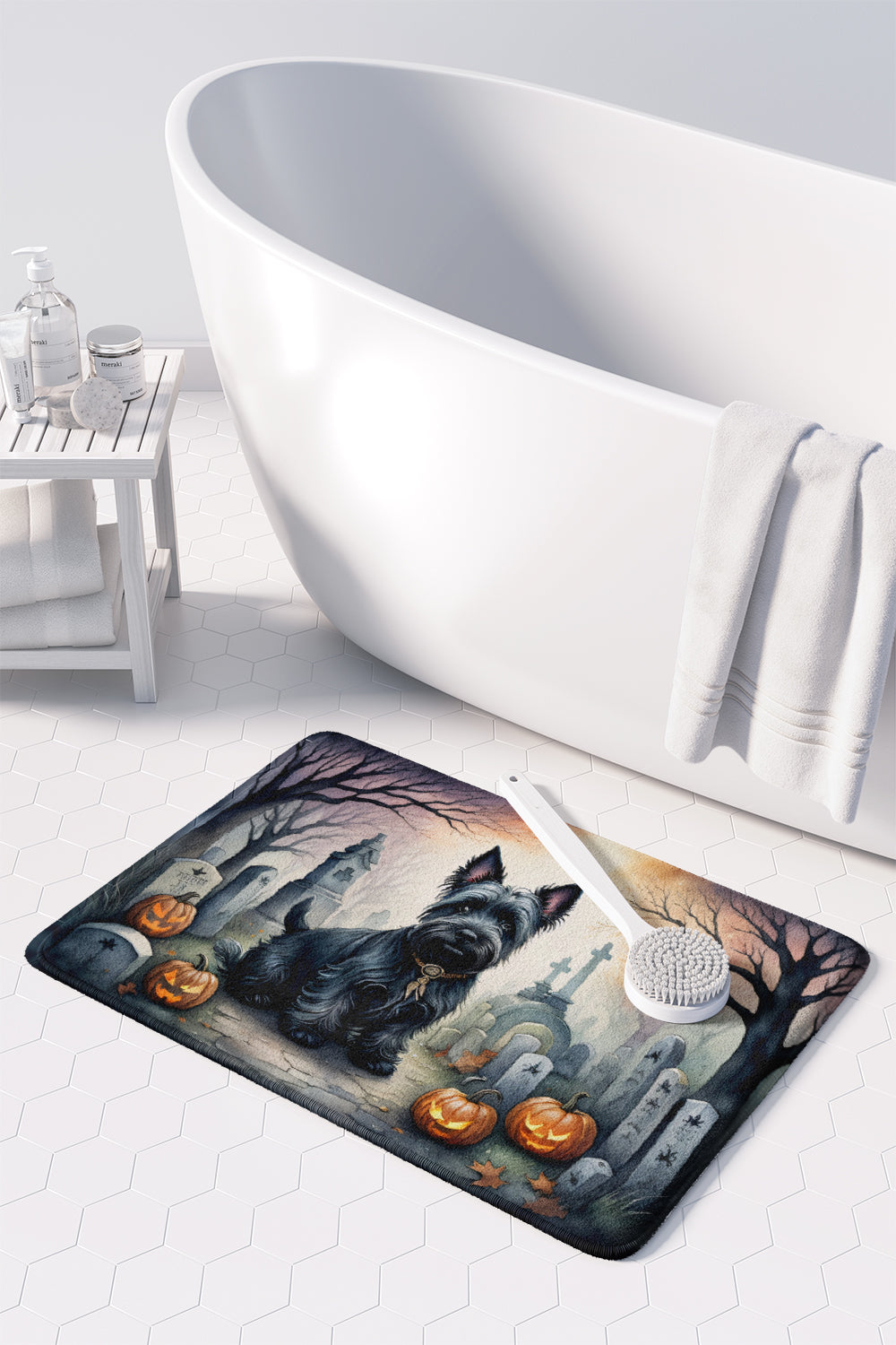 Memory Foam Kitchen Mat featuring breed specific Scottish Terrier artwork. Celebrate Halloween with this Halloween Floor Mat. Transform your floor into a work of art with Caroline's Treasures' Memory Foam Mat. This mat offers not only a stunning visual appeal but also a luxurious, plush feel that's incredibly comfortable to the touch. It's a versatile, machine-washable mat designed for both bath and kitchen use, ensuring you experience the best in comfort and convenience. Care Instructions: Maintaining this memory foam mat is a breeze. Simply follow the care instructions on the product tag. It's recommended to wash in cold water and dry on a low-temperature setting in the dryer. This ensures the mat retains its quality and longevity, allowing you to enjoy its beauty and comfort for a long time. Caroline's Treasures' Memory Foam Mat Machine Washable is the perfect blend of artistry, comfort, and practicality, making it a standout addition to any space. Upgrade your home decor with this versatile and stylish mat today.
