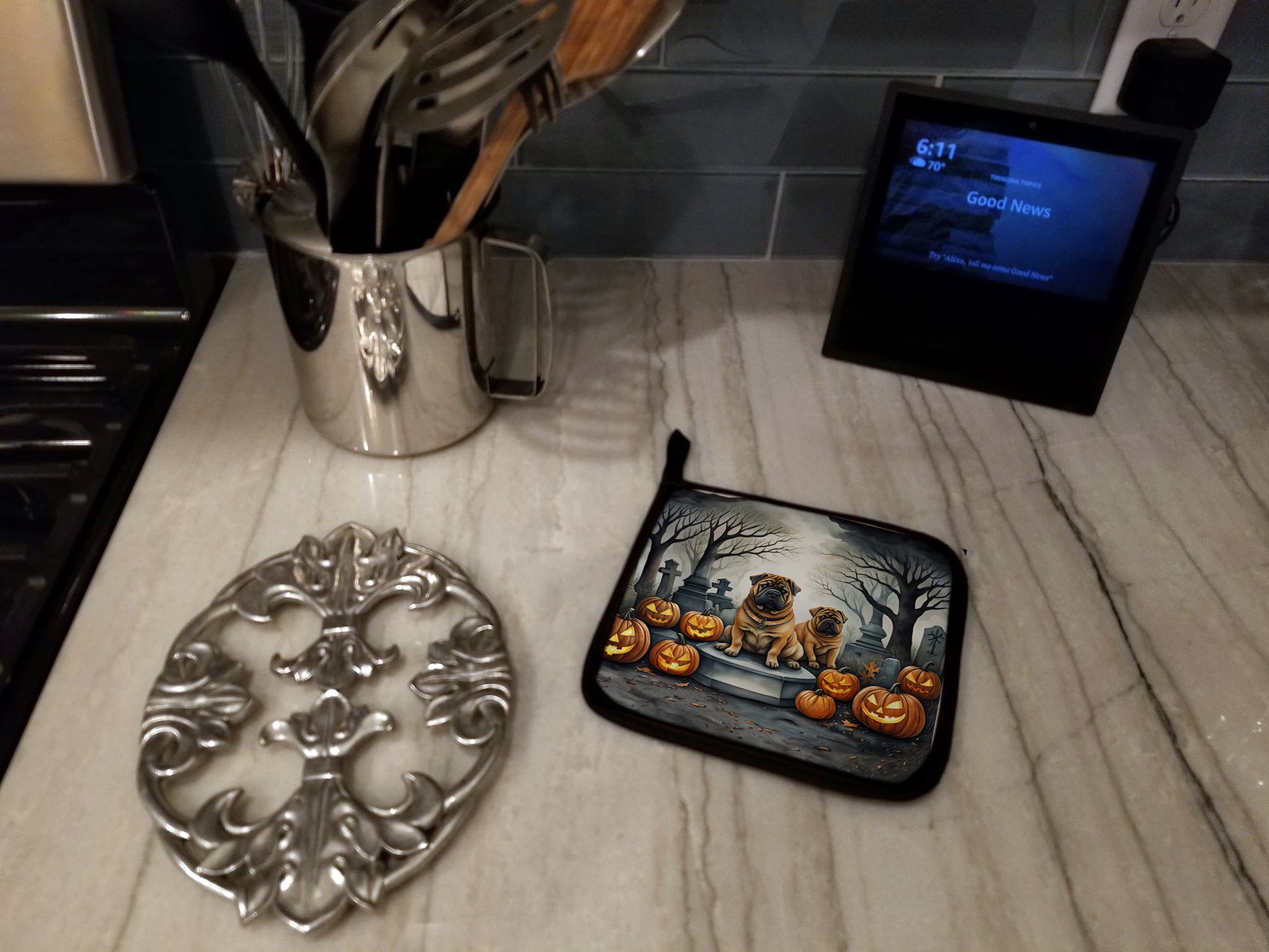 Pair of Pot Holders featuring breed specific Shar Pei artwork. Celebrate Halloween with this Halloween Pair of Pot Holders. A Pair of Pot Holders to match your kitchen decor. Made in the USA these are thick and functional. Full color artwork decorates the front polyester fabric of the hot pad and accented by a black trim. Use these at as a trivet for your Thanksgiving or Christmas tablescape. Filled with insulated fabric and quilted for durability. These colorful pot holders will make a great gift for your favorite home cook or executive chef. Each pot holder measures approximately 7 1/2 inches by 7 1/2 inches. A hanging tab is included.