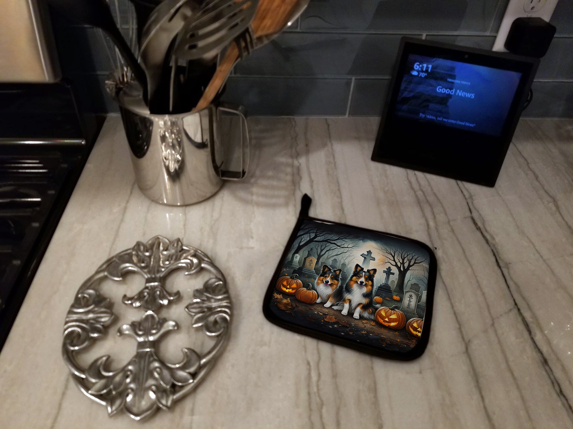Pair of Pot Holders featuring breed specific Sheltie artwork. Celebrate Halloween with this Halloween Pair of Pot Holders. A Pair of Pot Holders to match your kitchen decor. Made in the USA these are thick and functional. Full color artwork decorates the front polyester fabric of the hot pad and accented by a black trim. Use these at as a trivet for your Thanksgiving or Christmas tablescape. Filled with insulated fabric and quilted for durability. These colorful pot holders will make a great gift for your favorite home cook or executive chef. Each pot holder measures approximately 7 1/2 inches by 7 1/2 inches. A hanging tab is included.