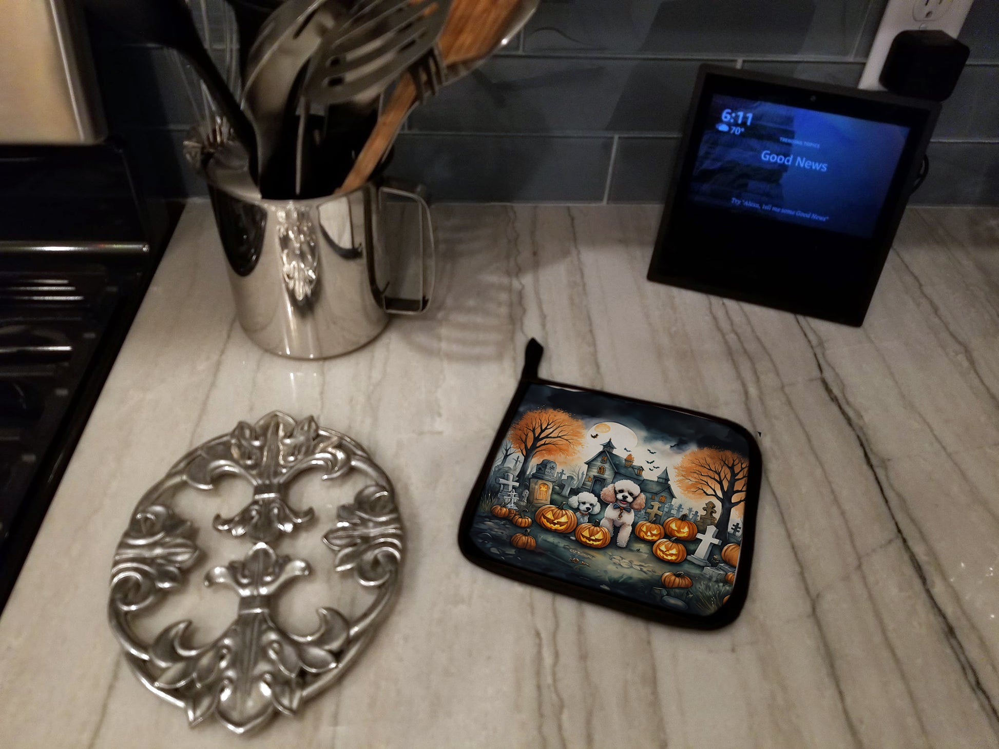 Pair of Pot Holders featuring breed specific Poodle artwork. Celebrate Halloween with this Halloween Pair of Pot Holders. A Pair of Pot Holders to match your kitchen decor. Made in the USA these are thick and functional. Full color artwork decorates the front polyester fabric of the hot pad and accented by a black trim. Use these at as a trivet for your Thanksgiving or Christmas tablescape. Filled with insulated fabric and quilted for durability. These colorful pot holders will make a great gift for your favorite home cook or executive chef. Each pot holder measures approximately 7 1/2 inches by 7 1/2 inches. A hanging tab is included.