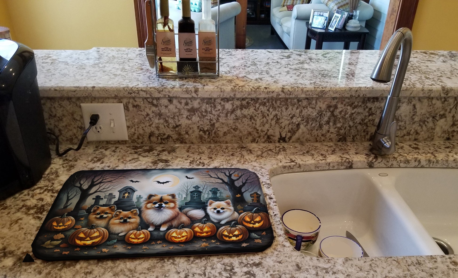 Dish Drying Mat featuring breed specific Pomeranian artwork. Celebrate Halloween with this Halloween Dish Drying Mat. Say goodbye to messy countertops and soggy dish towels with our innovative dish drying mat. Our high-quality dish drying pad is designed to keep your countertops dry while offering a stylish and efficient solution. Whether you're air drying dishes, glasses, stemware, silverware, pots, pans, bottles, or even fruits and vegetables, our dish mat is the perfect choice. The 14 inches x 22 inches size fits most counters and dish drying racks, and the non-slip design ensures stability. Made with water-absorbent polyester and a polyurethane foam insert, our dish drying mat is not only functional but also durable. It's machine washable and printed in the USA for long-lasting use. The beautiful artwork adds flair to your kitchen decor, making it a perfect housewarming gift or present for any occasion. Upgrade your kitchen experience with our absorbent and versatile dish drying mat.