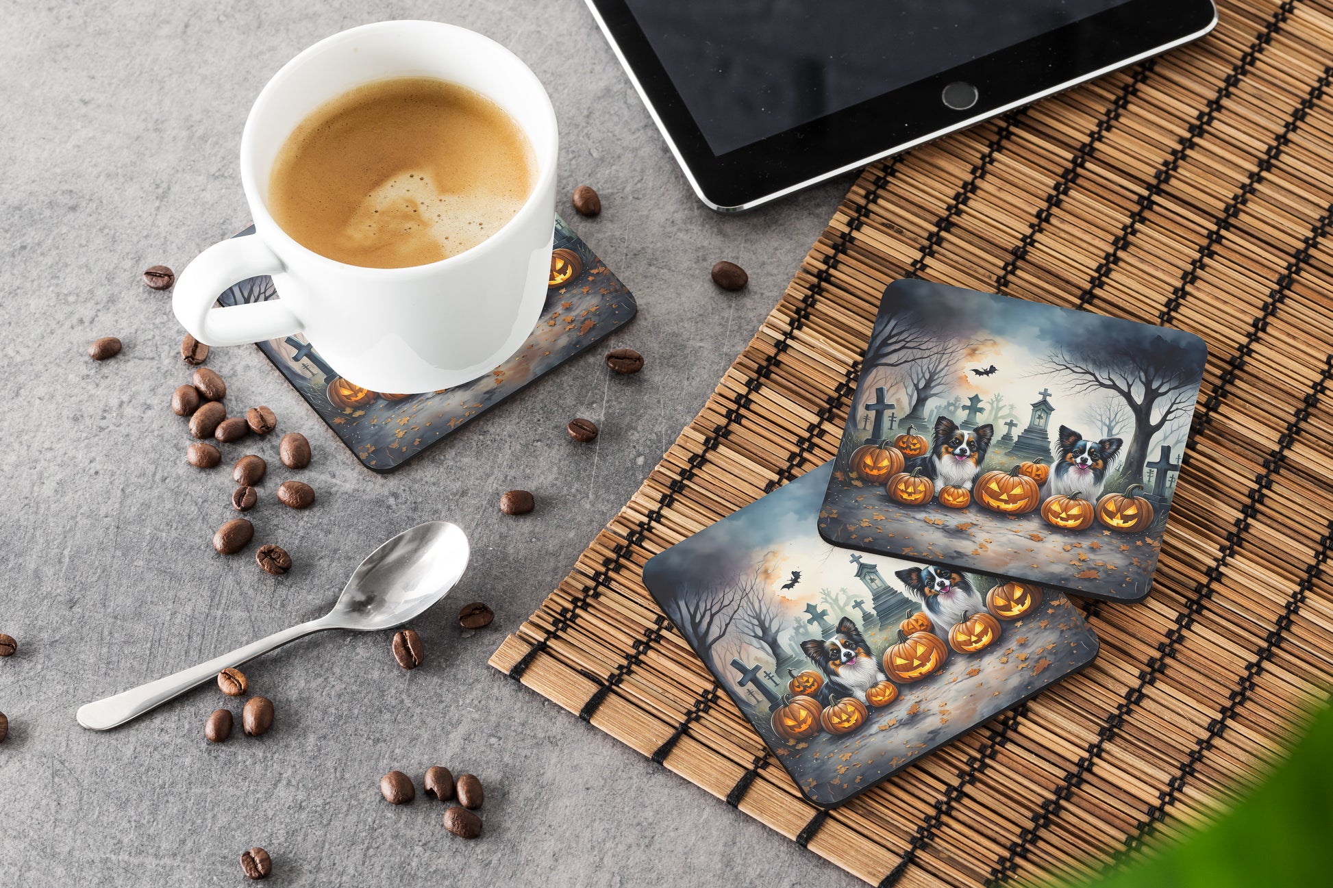 Foam Coasters featuring breed specific Papillon artwork. Celebrate Halloween with this Halloween Coaster set. Presenting our Set of 4 Foam Coasters, a stylish and practical addition to your table setting. Each square coaster, measuring 3 1/2 inches by 3 1/2 inches, is perfectly sized to accommodate various drinkware, from coffee mugs to tumblers. These coasters stand out with their full-color artwork, permanently dyed onto the material for a vibrant and fade-resistant finish. They're not just functional, they're a fashionable statement, adding a touch of flair to any gathering or event. Our foam coasters serve a dual purpose - they protect your table from water stains and are perfect for both hot and cold drinks. The material used is similar to that of our high-quality mouse pads, ensuring durability and heat resistance. These coasters are easy to maintain - simply wash them in the top of your dishwasher and lay flat to dry. The design won't come off, ensuring they retain their vivid colors for years. Pair them with one of our insulated coolers or huggers for a cohesive, thoughtful gift set. Enhance your beverage experience with our Set of 4 Foam Coasters.