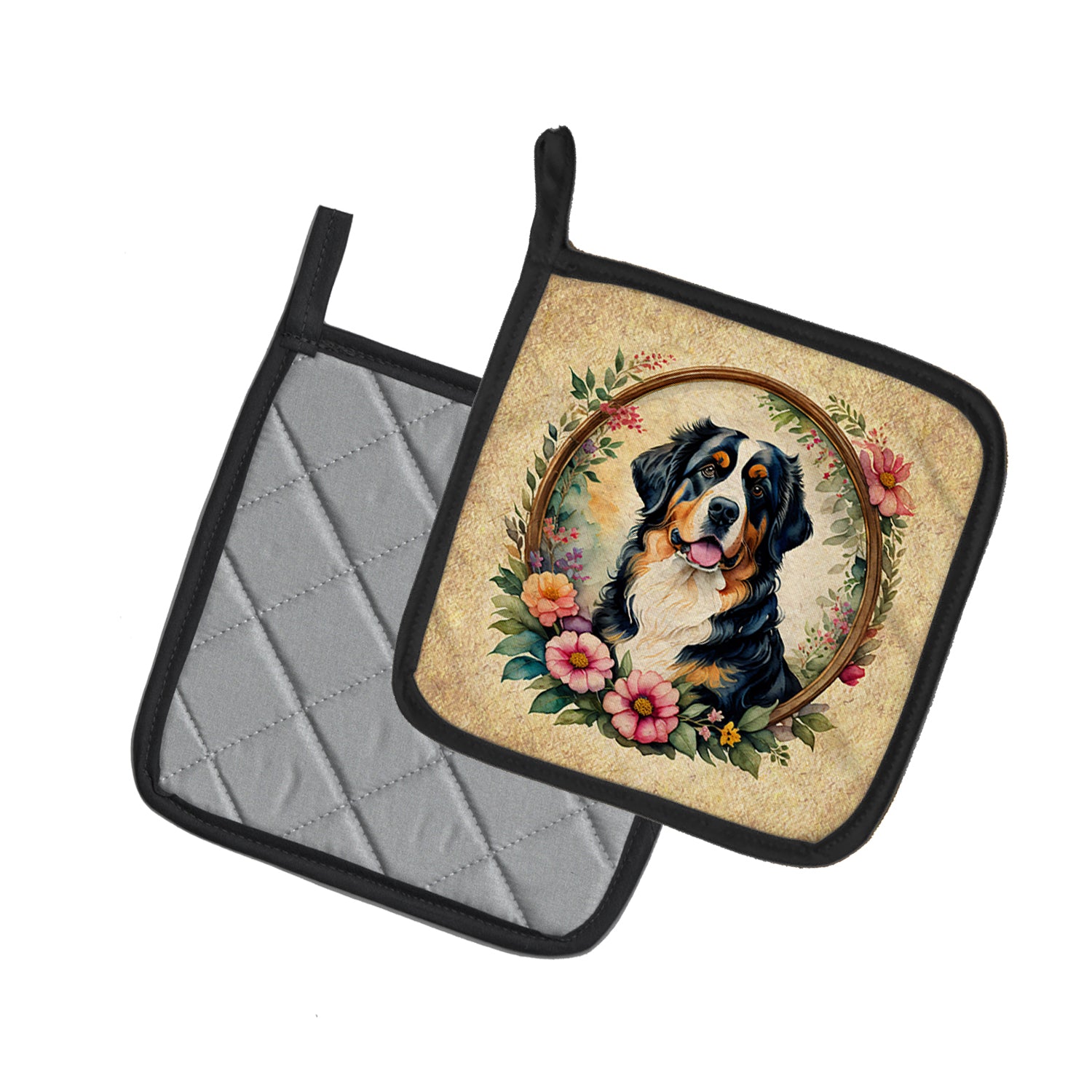 Bernese Mountain Dog and Flowers Pair of Pot Holders