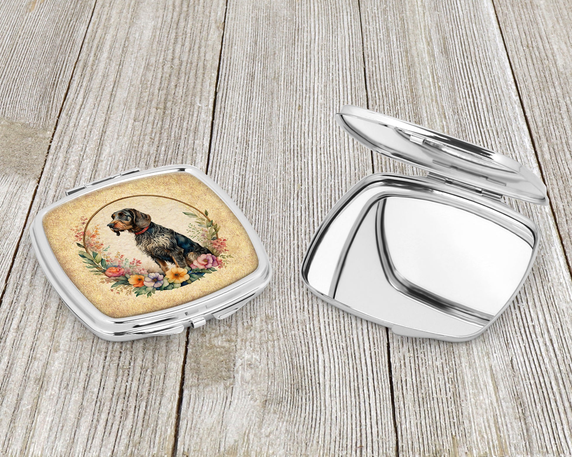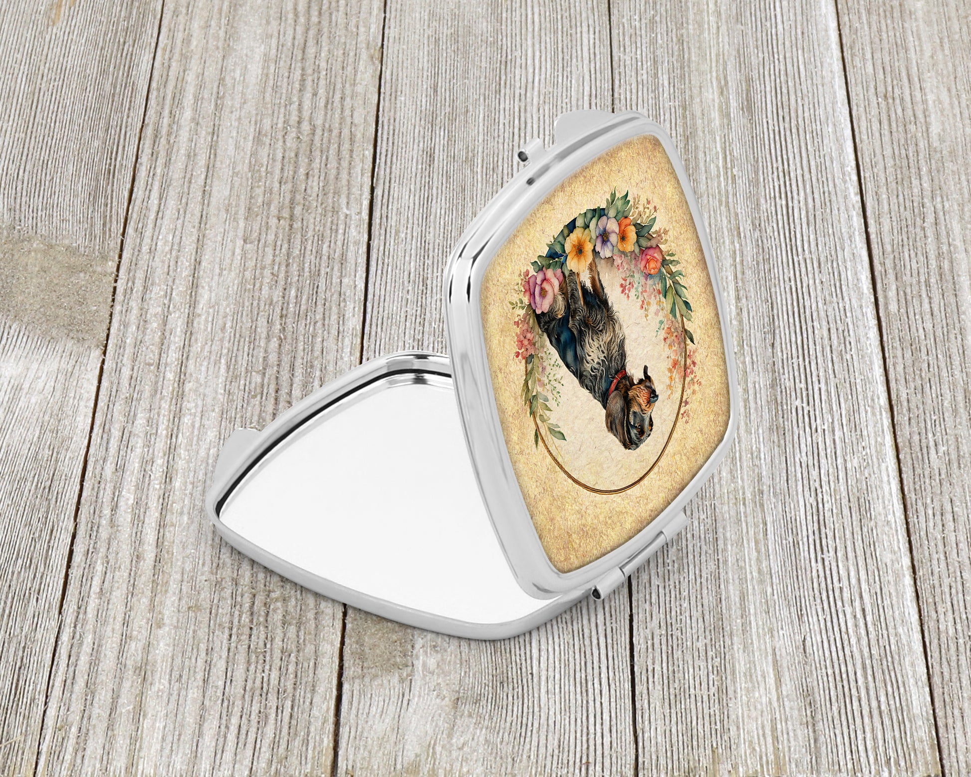 Compact Mirror featuring breed specific German Wirehaired Pointer artwork. Introducing our Square Compact Mirror, a blend of elegance, functionality, and compactness, perfect for on-the-go touch-ups. This Silvertone metal mirror, with dimensions of 2.75 inches x 3 inches x .3 inches, fits effortlessly into your purse, handbag, or pocket, ensuring that you can check your appearance anytime, anywhere. Our compact mirror stands out with its eye-catching artwork on the front, adding a dash of style to this practical accessory. It is more than just a mirror; it's a statement piece that reflects your personality and aesthetic. When opened, this compact reveals two mirrors inside, doubling your perspective for precise touch-ups. The Silvertone metal construction ensures durability while maintaining a lightweight feel, making it an ideal everyday carry item. Whether you're rushing to a meeting, prepping for a dinner date, or just need a quick check on your look, our Square Compact Mirror is your reliable companion. Experience the perfect blend of style and practicality with this must-have accessory.
