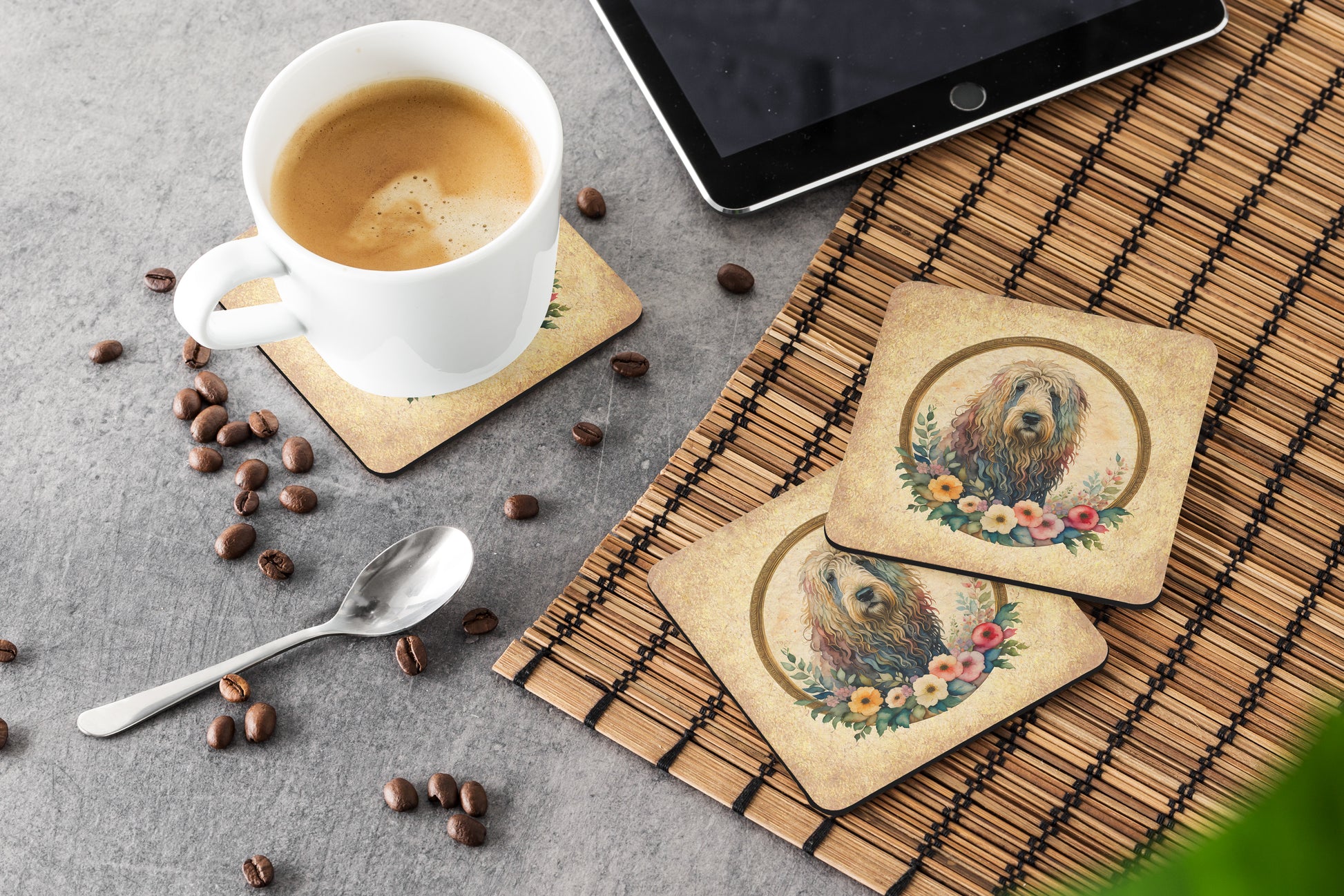 Foam Coasters featuring breed specific Komondor artwork. Presenting our Set of 4 Foam Coasters, a stylish and practical addition to your table setting. Each square coaster, measuring 3 1/2 inches by 3 1/2 inches, is perfectly sized to accommodate various drinkware, from coffee mugs to tumblers. These coasters stand out with their full-color artwork, permanently dyed onto the material for a vibrant and fade-resistant finish. They're not just functional, they're a fashionable statement, adding a touch of flair to any gathering or event. Our foam coasters serve a dual purpose - they protect your table from water stains and are perfect for both hot and cold drinks. The material used is similar to that of our high-quality mouse pads, ensuring durability and heat resistance. These coasters are easy to maintain - simply wash them in the top of your dishwasher and lay flat to dry. The design won't come off, ensuring they retain their vivid colors for years. Pair them with one of our insulated coolers or huggers for a cohesive, thoughtful gift set. Enhance your beverage experience with our Set of 4 Foam Coasters.