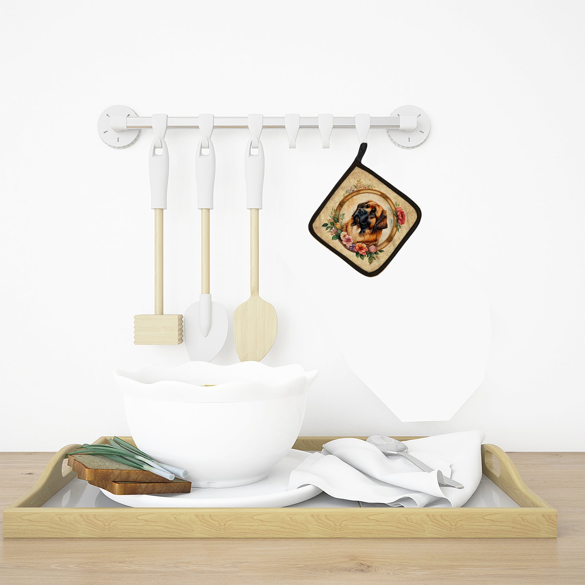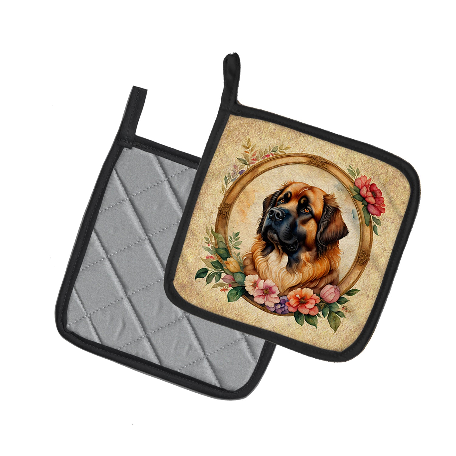 Leonberger and Flowers Pair of Pot Holders