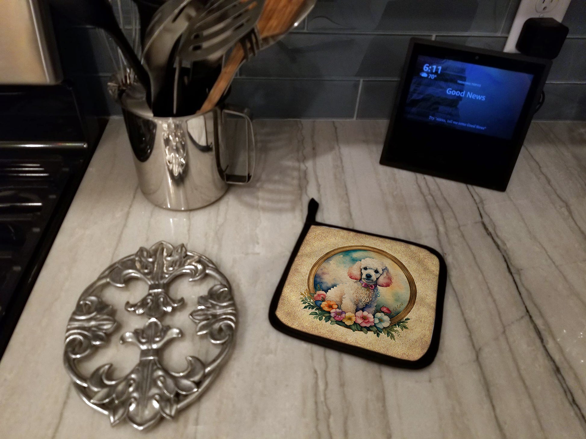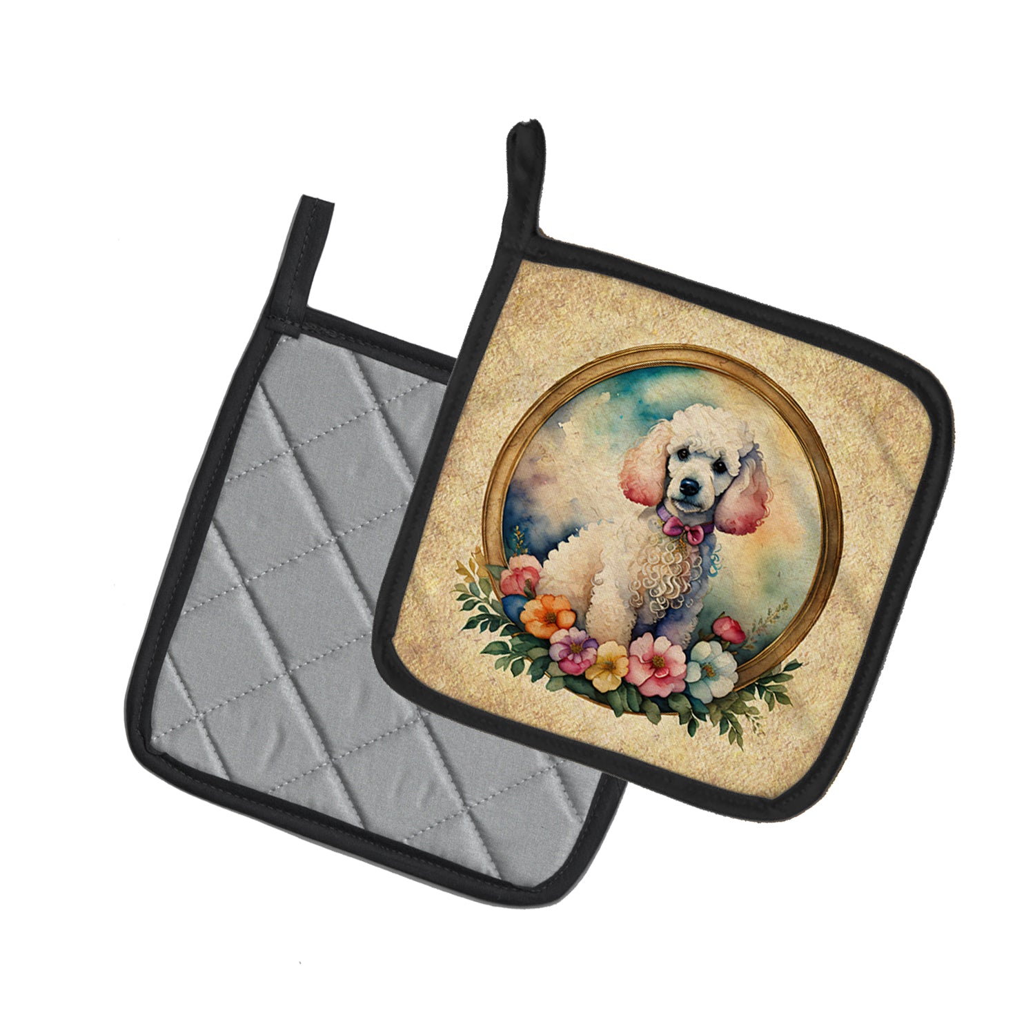 Pair of Pot Holders featuring breed specific Poodle artwork. A Pair of Pot Holders to match your kitchen decor. Made in the USA these are thick and functional. Full color artwork decorates the front polyester fabric of the hot pad and accented by a black trim. Use these at as a trivet for your Thanksgiving or Christmas tablescape. Filled with insulated fabric and quilted for durability. These colorful pot holders will make a great gift for your favorite home cook or executive chef. Each pot holder measures approximately 7 1/2 inches by 7 1/2 inches. A hanging tab is included.