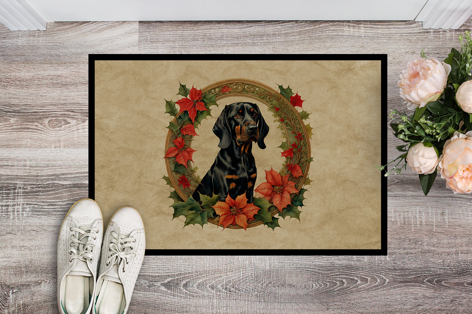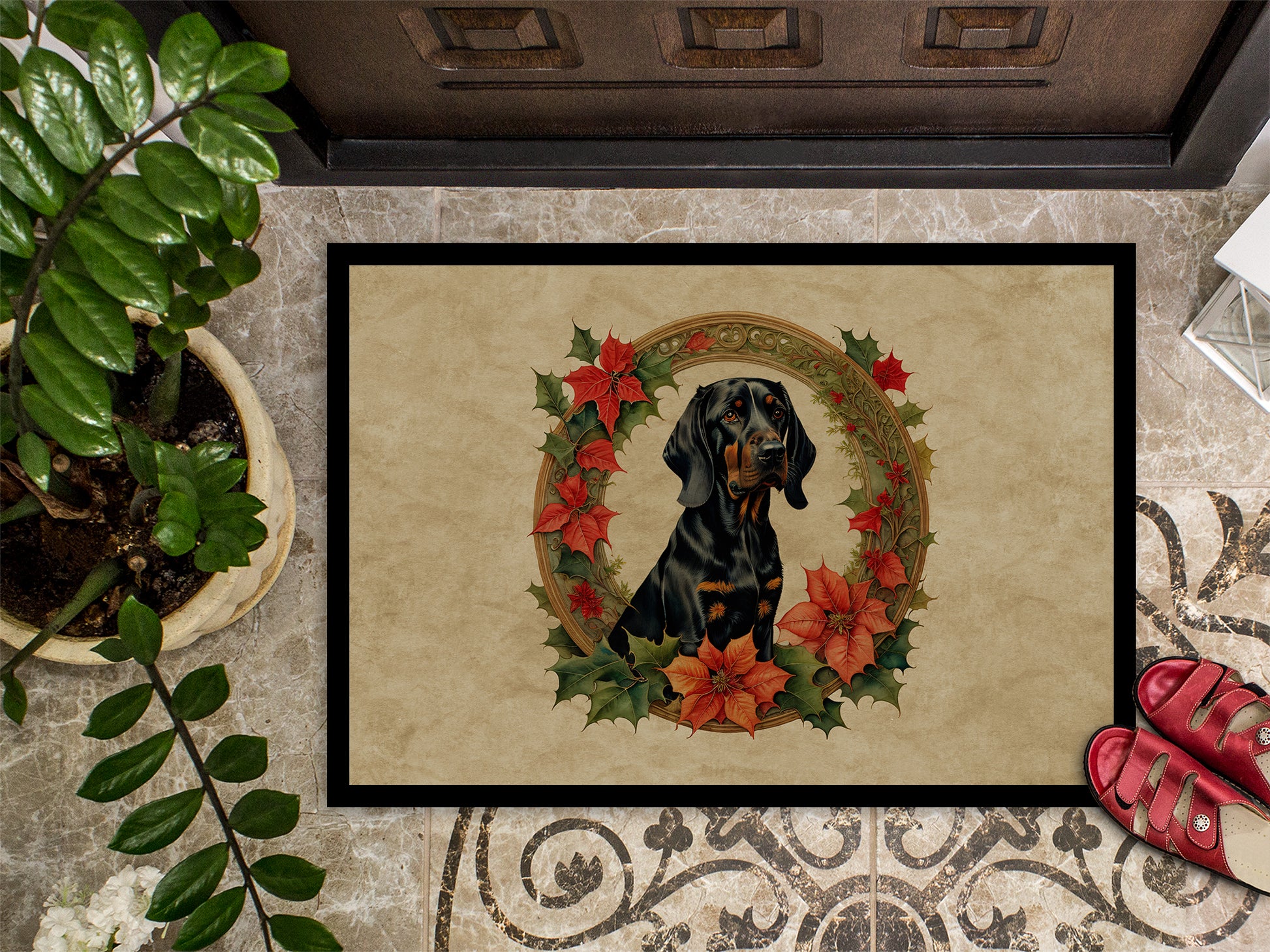 Doormat featuring breed specific Black and Tan Coonhound artwork. Celebrate Christmas with this Christmas Doormat. Welcome your guests in style with our Artwork Door Mat, designed to withstand almost any weather condition. This mat, measuring approximately 24 by 36 inches, is held together by durable black binding tape. Its top layer, composed of polyester felt, is dyed with the eye-catching image you see on the mat. A few layers below provide the mat with stability, while its rubber bottom is stamped to help prevent slipping and ensures safety. Our mat works wonderfully as both an indoor or outdoor door mat. For cleaning, simply hose it off with water or use a power washer - no need for any cleaner that produces suds. Avoid scrubbing with a brush, instead, opt for the vacuum on floor setting. Designed manufactured and printed in the USA, this mat is a perfect addition to your porch, outdoor kitchen, entryway, or any indoor space. Its unique design makes it a charming decorative rug that greets your guests and adds a stylish touch to your home decor.