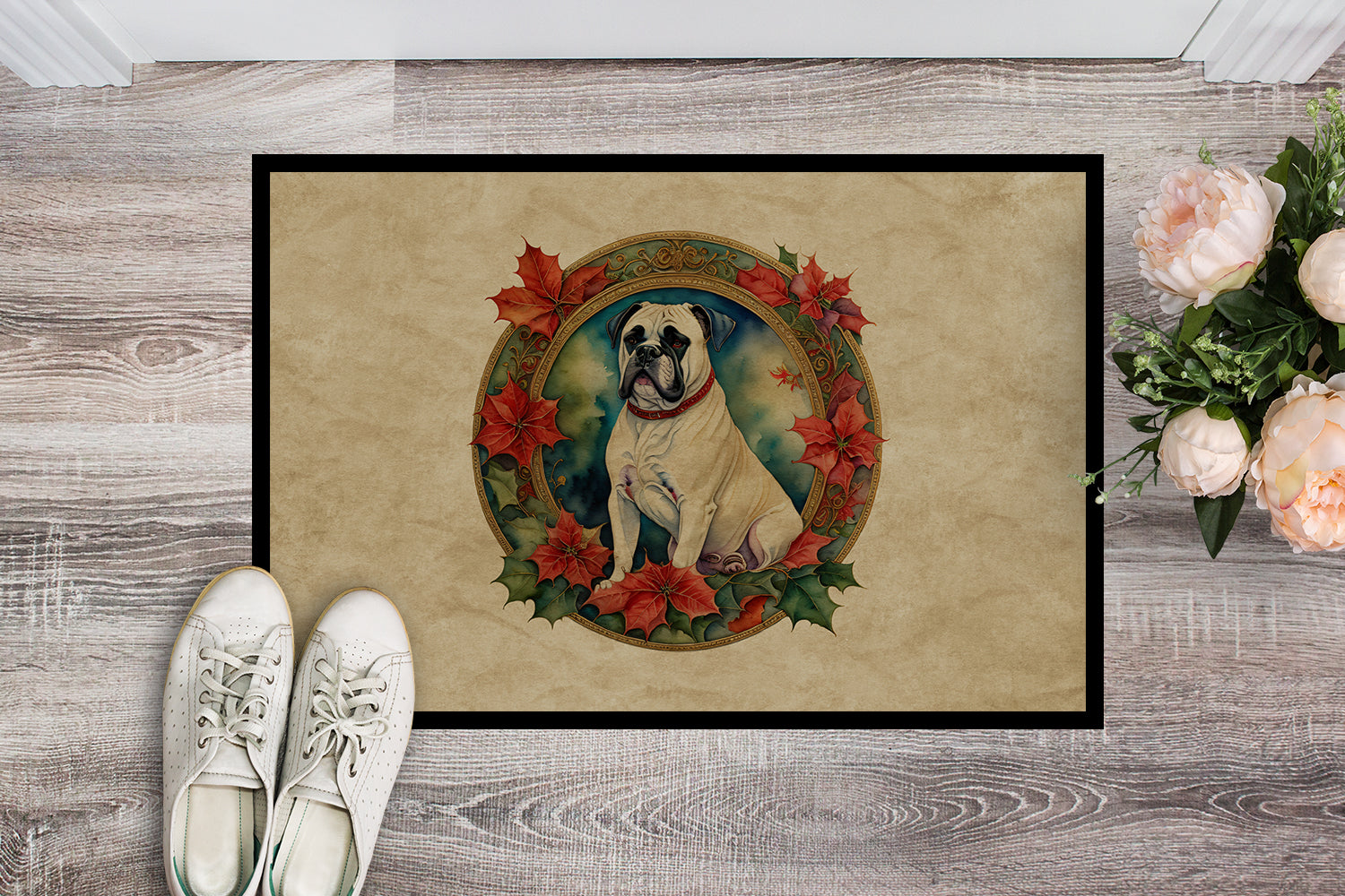 White Boxer Christmas Flowers Doormat