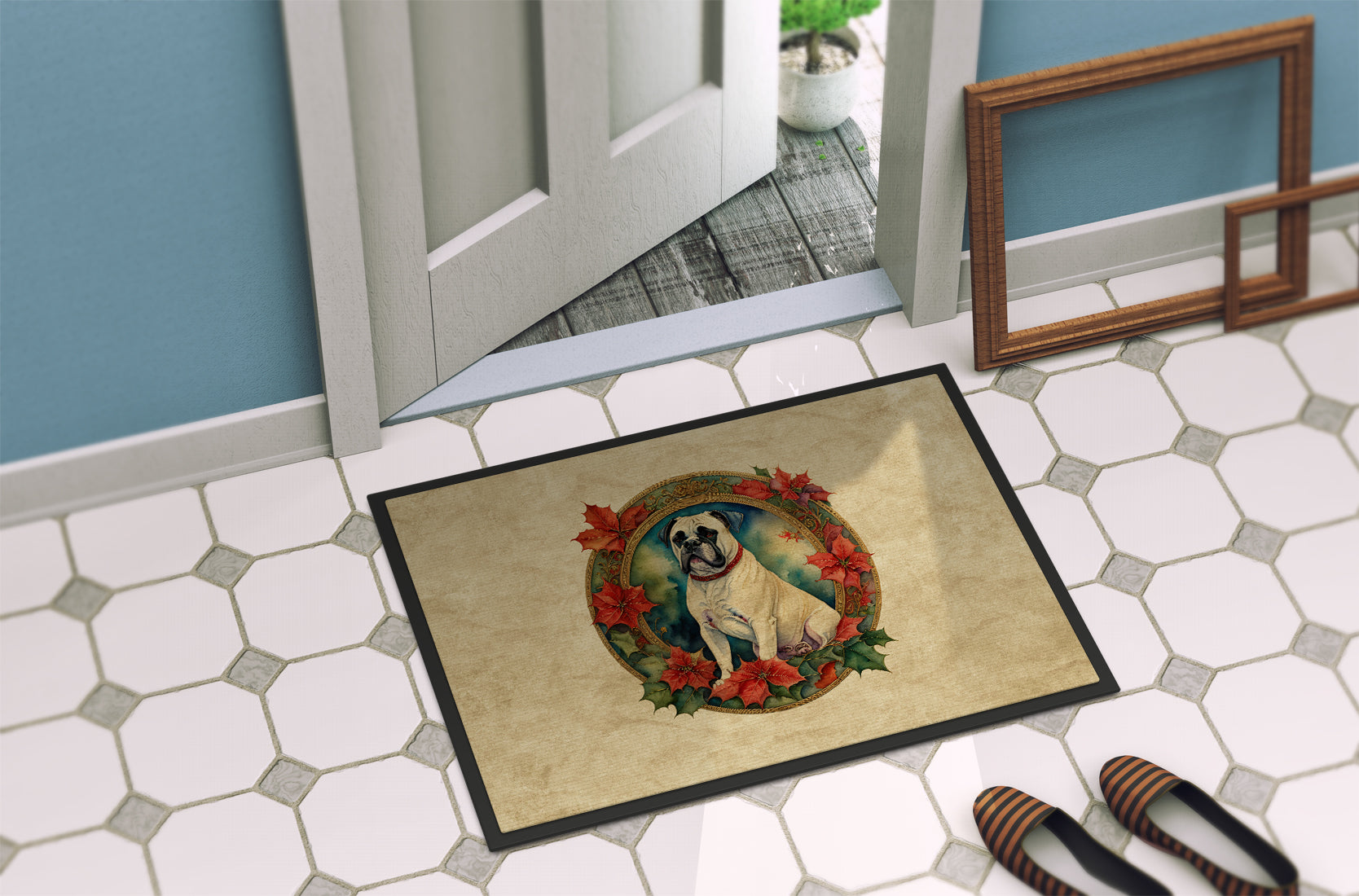 Doormat featuring breed specific Boxer artwork. Celebrate Christmas with this Christmas Doormat. Welcome your guests in style with our Artwork Door Mat, designed to withstand almost any weather condition. This mat, measuring approximately 24 by 36 inches, is held together by durable black binding tape. Its top layer, composed of polyester felt, is dyed with the eye-catching image you see on the mat. A few layers below provide the mat with stability, while its rubber bottom is stamped to help prevent slipping and ensures safety. Our mat works wonderfully as both an indoor or outdoor door mat. For cleaning, simply hose it off with water or use a power washer - no need for any cleaner that produces suds. Avoid scrubbing with a brush, instead, opt for the vacuum on floor setting. Designed manufactured and printed in the USA, this mat is a perfect addition to your porch, outdoor kitchen, entryway, or any indoor space. Its unique design makes it a charming decorative rug that greets your guests and adds a stylish touch to your home decor.