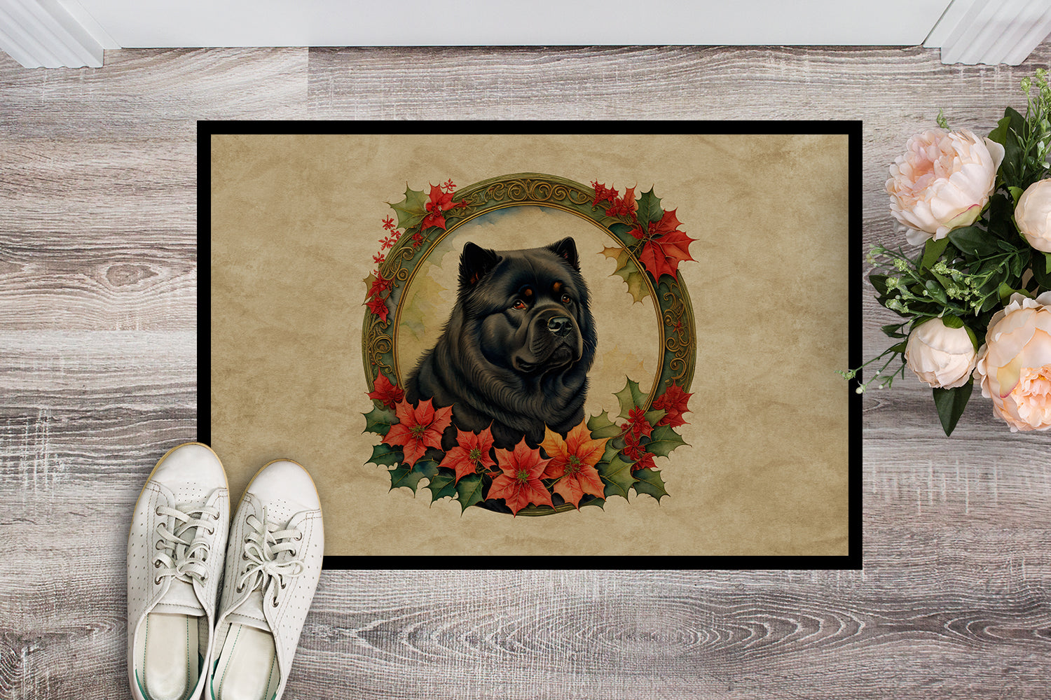 Doormat featuring breed specific Chow Chow artwork. Celebrate Christmas with this Christmas Doormat. Welcome your guests in style with our Artwork Door Mat, designed to withstand almost any weather condition. This mat, measuring approximately 18 by 27 inches, is held together by durable black binding tape. Its top layer, composed of polyester felt, is dyed with the eye-catching image you see on the mat. A few layers below provide the mat with stability, while its rubber bottom is stamped to help prevent slipping and ensures safety. Our mat works wonderfully as both an indoor or outdoor door mat. For cleaning, simply hose it off with water or use a power washer - no need for any cleaner that produces suds. Avoid scrubbing with a brush, instead, opt for the vacuum on floor setting. Designed manufactured and printed in the USA, this mat is a perfect addition to your porch, outdoor kitchen, entryway, or any indoor space. Its unique design makes it a charming decorative rug that greets your guests and adds a stylish touch to your home decor.