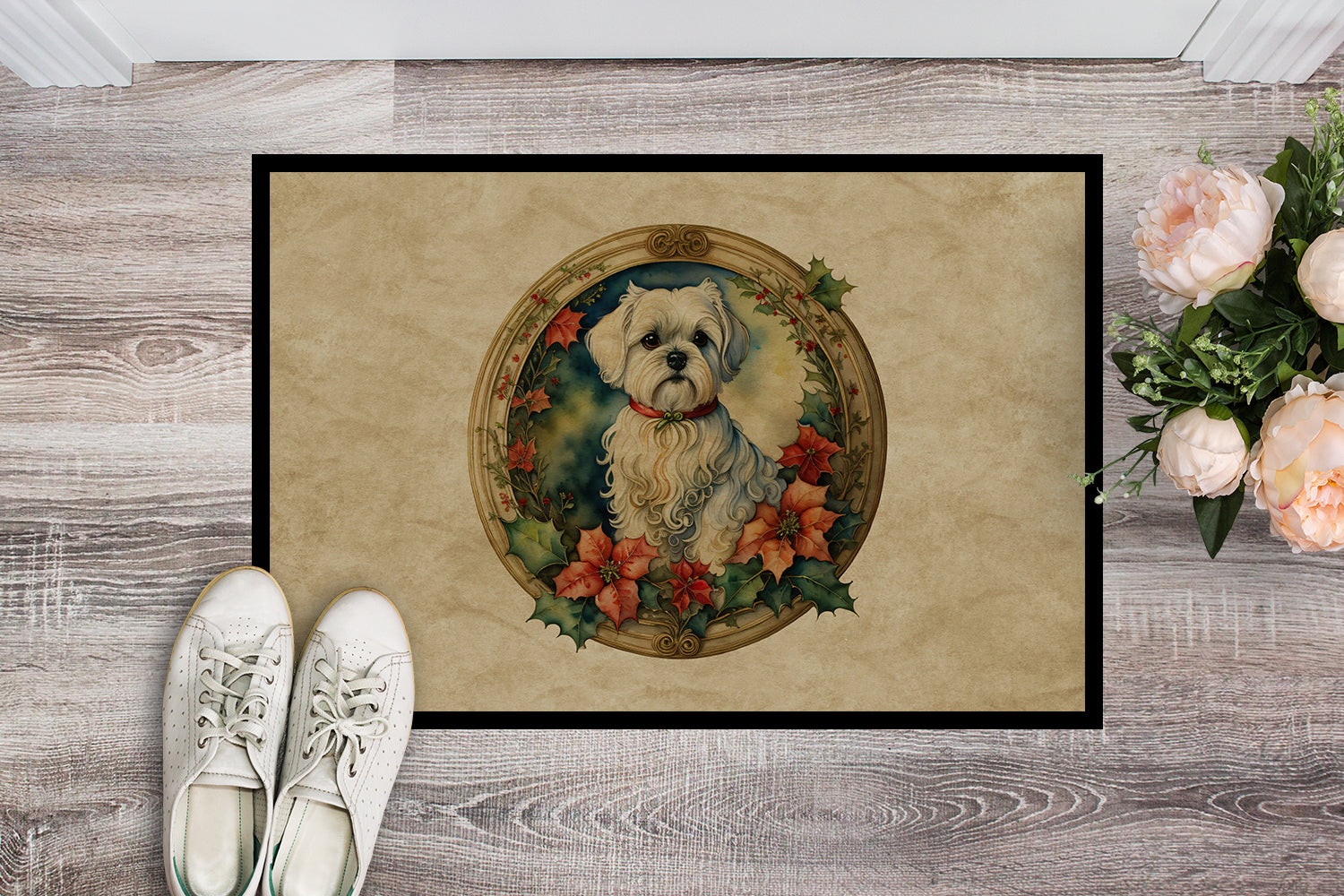 Doormat featuring breed specific Maltese artwork. Celebrate Christmas with this Christmas Doormat. Welcome your guests in style with our Artwork Door Mat, designed to withstand almost any weather condition. This mat, measuring approximately 18 by 27 inches, is held together by durable black binding tape. Its top layer, composed of polyester felt, is dyed with the eye-catching image you see on the mat. A few layers below provide the mat with stability, while its rubber bottom is stamped to help prevent slipping and ensures safety. Our mat works wonderfully as both an indoor or outdoor door mat. For cleaning, simply hose it off with water or use a power washer - no need for any cleaner that produces suds. Avoid scrubbing with a brush, instead, opt for the vacuum on floor setting. Designed manufactured and printed in the USA, this mat is a perfect addition to your porch, outdoor kitchen, entryway, or any indoor space. Its unique design makes it a charming decorative rug that greets your guests and adds a stylish touch to your home decor.
