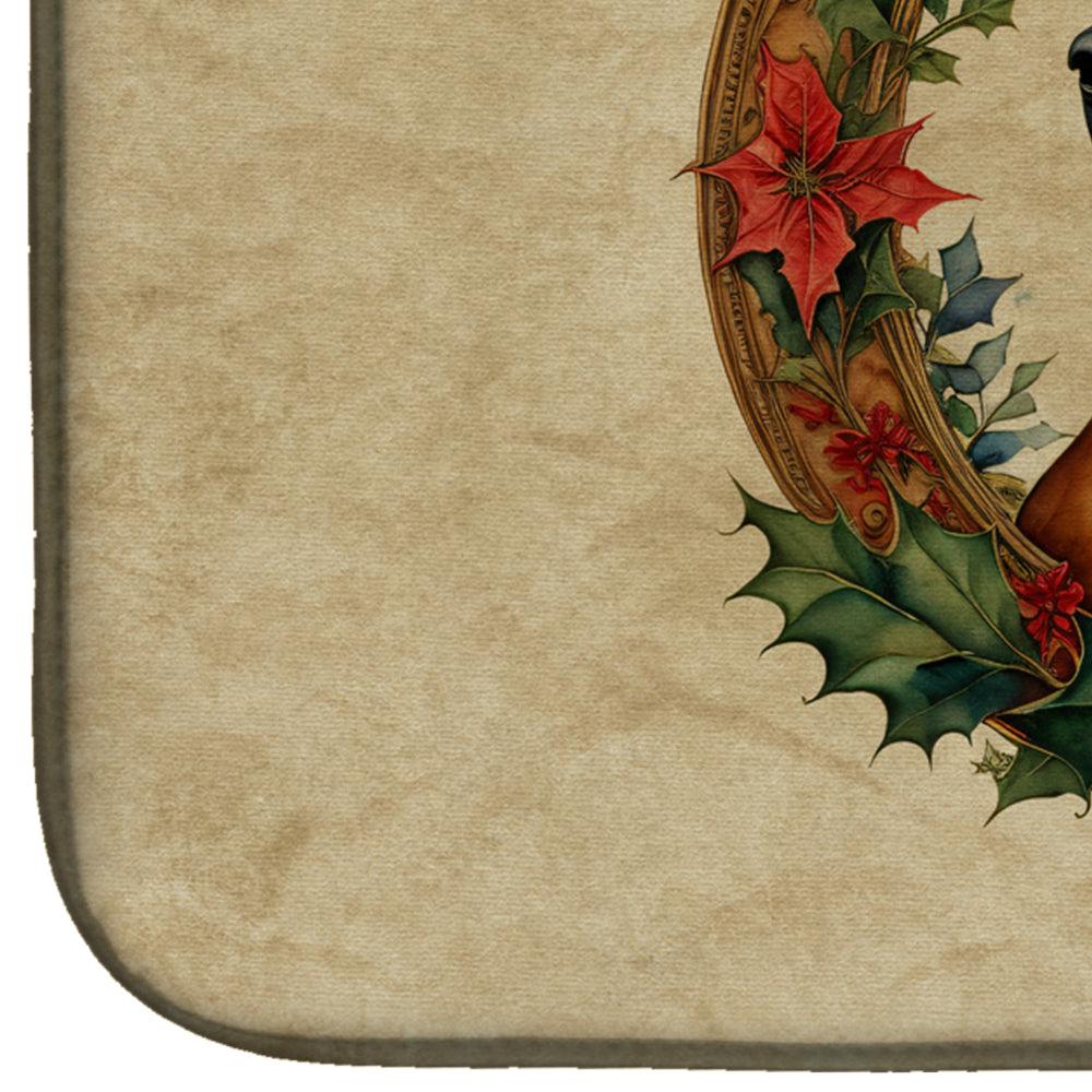 Dish Drying Mat featuring breed specific Rhodesian Ridgeback artwork. Celebrate Christmas with this Christmas Dish Drying Mat. Say goodbye to messy countertops and soggy dish towels with our innovative dish drying mat. Our high-quality dish drying pad is designed to keep your countertops dry while offering a stylish and efficient solution. Whether you're air drying dishes, glasses, stemware, silverware, pots, pans, bottles, or even fruits and vegetables, our dish mat is the perfect choice. The 14 inches x 22 inches size fits most counters and dish drying racks, and the non-slip design ensures stability. Made with water-absorbent polyester and a polyurethane foam insert, our dish drying mat is not only functional but also durable. It's machine washable and printed in the USA for long-lasting use. The beautiful artwork adds flair to your kitchen decor, making it a perfect housewarming gift or present for any occasion. Upgrade your kitchen experience with our absorbent and versatile dish drying mat.