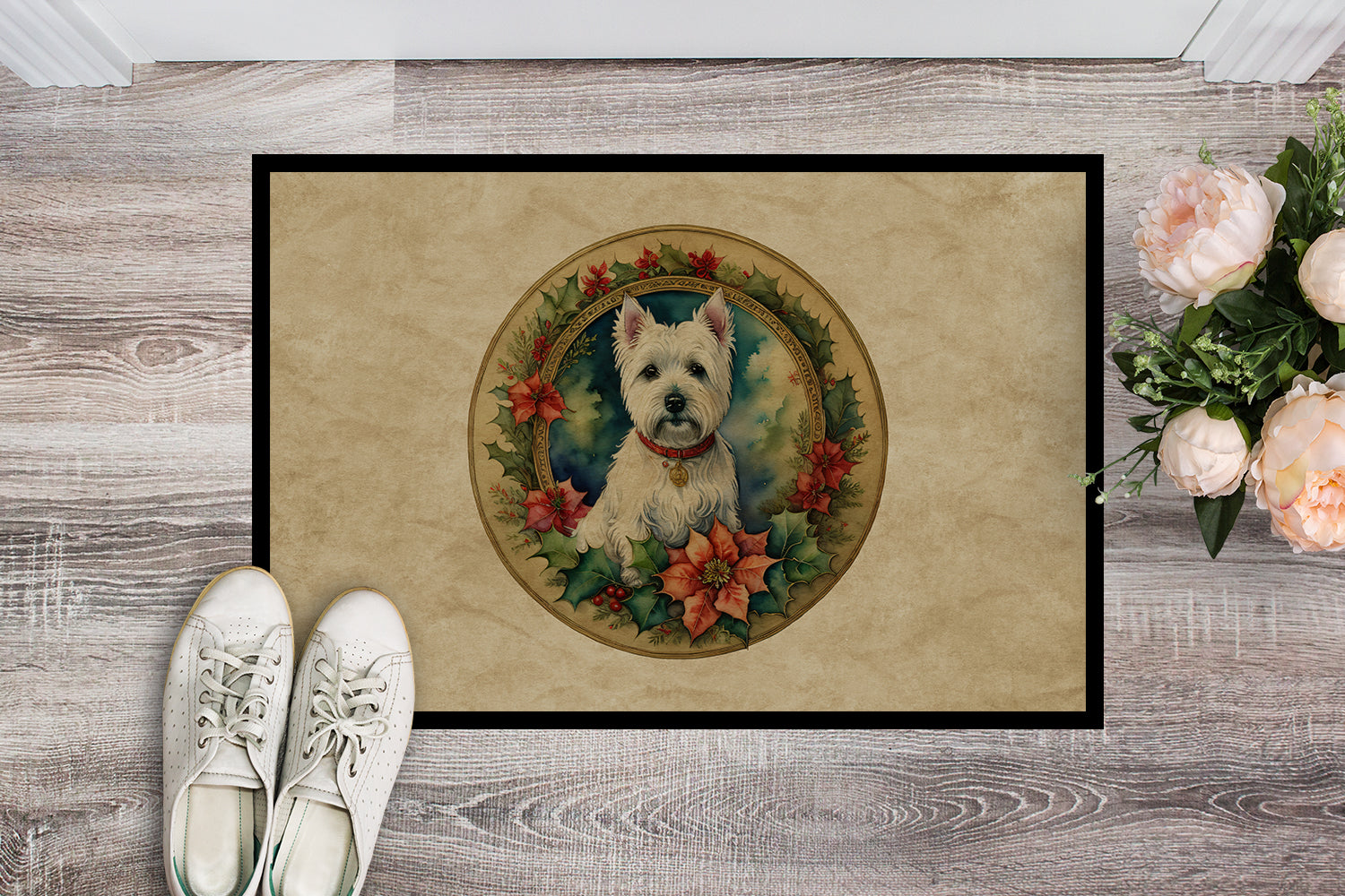 Doormat featuring breed specific West Highland White Terrier artwork. Celebrate Christmas with this Christmas Doormat. Welcome your guests in style with our Artwork Door Mat, designed to withstand almost any weather condition. This mat, measuring approximately 24 by 36 inches, is held together by durable black binding tape. Its top layer, composed of polyester felt, is dyed with the eye-catching image you see on the mat. A few layers below provide the mat with stability, while its rubber bottom is stamped to help prevent slipping and ensures safety. Our mat works wonderfully as both an indoor or outdoor door mat. For cleaning, simply hose it off with water or use a power washer - no need for any cleaner that produces suds. Avoid scrubbing with a brush, instead, opt for the vacuum on floor setting. Designed manufactured and printed in the USA, this mat is a perfect addition to your porch, outdoor kitchen, entryway, or any indoor space. Its unique design makes it a charming decorative rug that greets your guests and adds a stylish touch to your home decor.