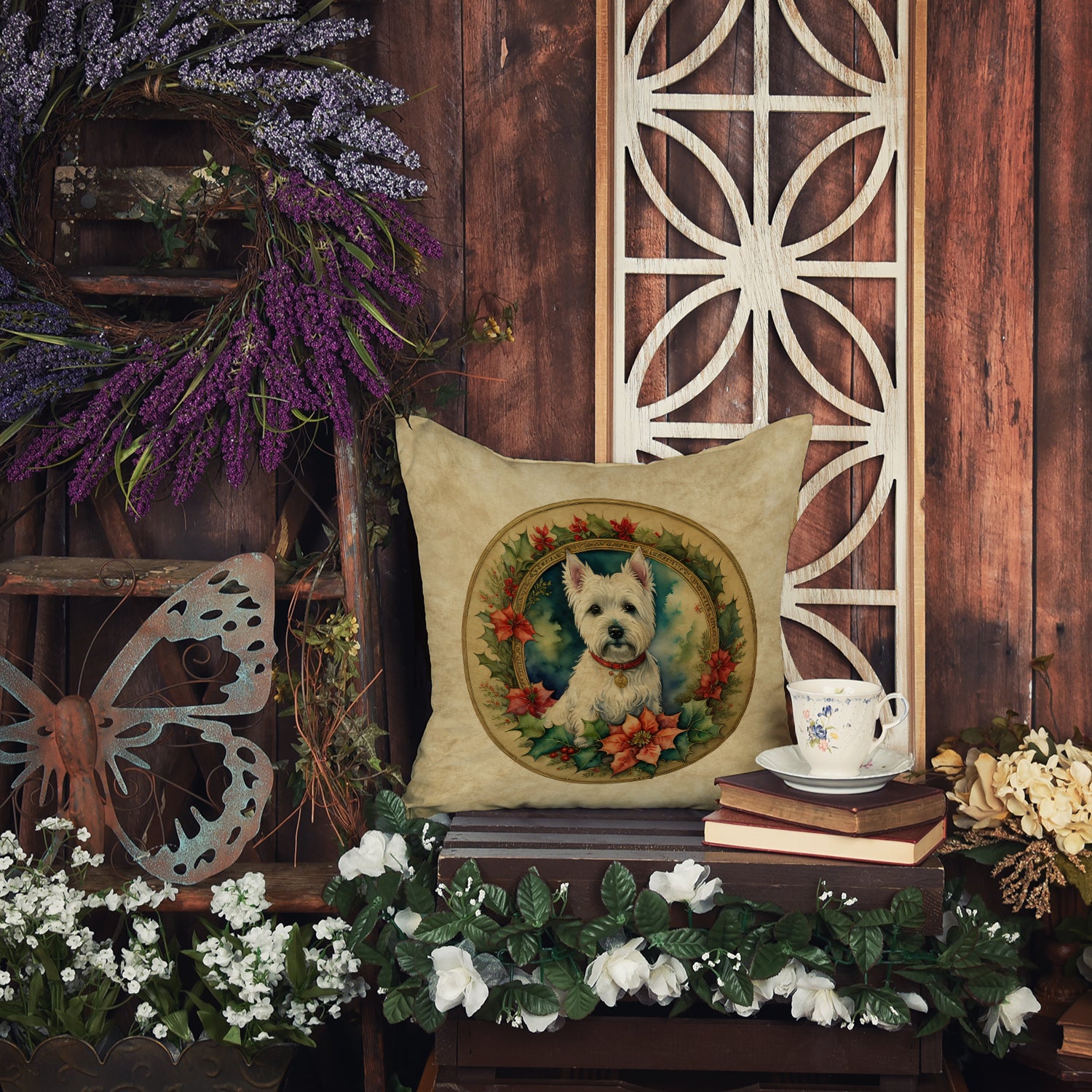 Throw Pillow featuring breed specific West Highland White Terrier artwork. Celebrate Christmas with this Christmas Pillow. Revitalize your outdoor or indoor living space with Caroline's Treasures 18x18 Fabric Decorative Pillow. With a generously sized dimension of approximately 18 inches by 18 inches, this pillow makes a comfortable and aesthetic addition to any seating area. Made from a unique, water-resistant material developed by Caroline's Treasures, the pillow sham is 100% polyester fabric that's durable and ready to weather any condition. Its vibrant, full-color artwork will not fade over time as it is dyed with color-fast dyes. Whether you place it on your patio furniture, porch, veranda, or indoor couch, its soft canvas fabric ensures a cozy experience. The pillow is handcrafted in the United States, featuring a sham created from three pieces of fabric and a polyester insert for enduring shape and overstuffed comfort. Despite being robustly built to endure the outdoors, it is as soft and snug as your favorite indoor cushions. Please note, as all our pillows are handmade, sizes may vary slightly, adding to the charm of this unique decorative item.
