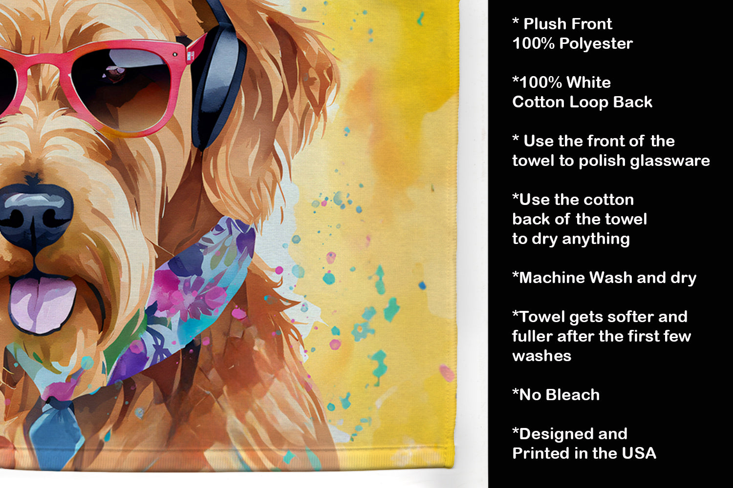 Kitchen Towel featuring breed specific Airedale Terrier artwork. Experience the perfect blend of aesthetic appeal and functional excellence with our Plush Velour Kitchen Towels. These are not your ordinary decorative kitchen towels that gather dust. Instead, they are designed to be as practical as they are stylish. The front layer of our towel is constructed from a minky plush polyester, known for its durability and color retention. Unlike conventional kitchen towels, the artwork on our towels is dyed directly into the fabric, ensuring vibrant colors that last. Polish your glassware to a brilliant sparkle using the plush front side of the towel. Flip to the back, crafted from 100% cotton terry loop, to exploit its exceptional absorbency for drying dishes or wiping down counters. Our kitchen towels redefine the concept of functional art, offering lasting quality that maintains the towel's shape over time. Measuring 15 inches by 25 inches and weighing 2.3 lbs per dozen, these towels deliver an overwhelming sensory experience with their soft, plush, and smooth texture. The edges are meticulously finished with binding, enhancing their durability and visual appeal. For your convenience, these towels are machine washable and can be dried on low heat. After the first wash, the top fabric becomes even softer and fluffier, eliminating the need for ironing. Treat your kitchen to the luxury and functionality it deserves with our plush velour kitchen towels.