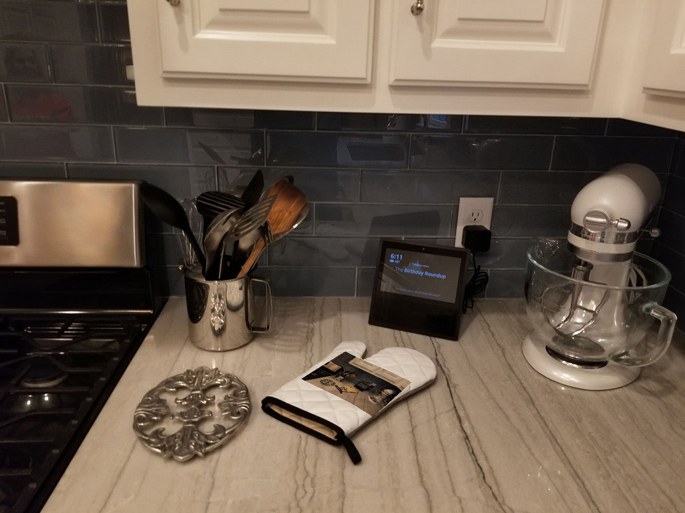 Oven Mitt featuring breed specific Akita artwork. Presenting our Large Right Hand Thick Heat Resistant Oven Mitt, an indispensable tool for any culinary enthusiast. This mitt boasts layers of quilted protection on both sides, providing outstanding resistance against extreme heat. Embellished with beautifully printed artwork, it adds an extra dash of charm to your kitchen decor. At about 12 inches long and 8 1/2 inches wide, this oven mitt offers a generous fit, accommodating a diverse range of hand sizes. Its design is enhanced by a sleek Black bias tape trim, finished with a convenient hoop for easy hanging. Fresh out of the packaging, the quilting process may give the mitt a stiff feel, but rest assured, it will soften with use and washing. Our mitt is crafted with a unique center fabric, Insul-Bright, a composite material made from polyester fibers, needle-punched through a nonwoven substrate and a reflective metallized film. This smart material resists both conduction and radiant energy, reflecting heat back to its source, all while remaining breathable. Our oven mitt is machine washable and safe for tumble drying. It's a perfect gift for your favorite Chef, BBQ enthusiast, or just a little treat for yourself! Experience safety, style, and convenience rolled into one with this exceptional oven mitt.