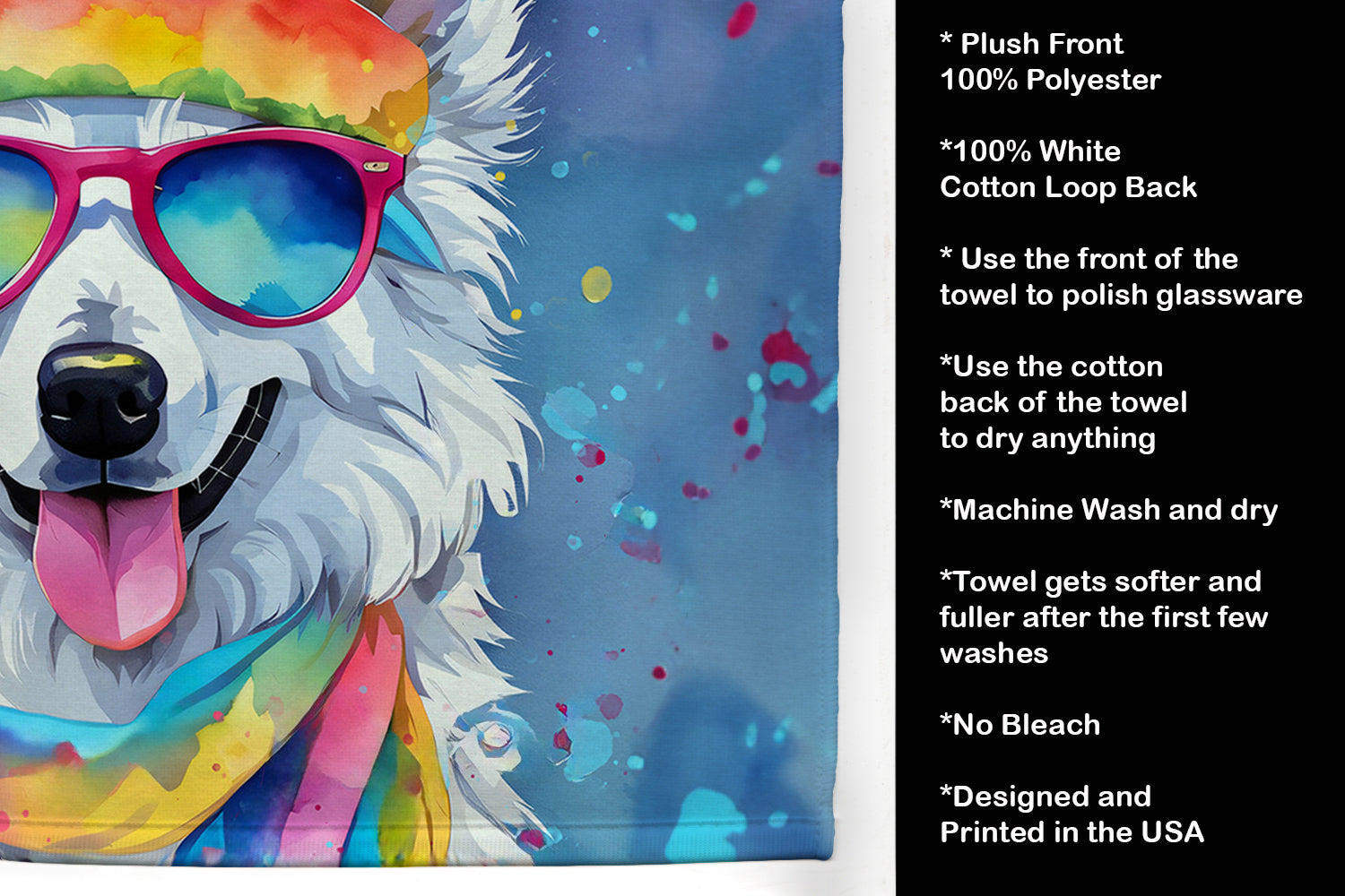 Kitchen Towel featuring breed specific American Eskimo artwork. Experience the perfect blend of aesthetic appeal and functional excellence with our Plush Velour Kitchen Towels. These are not your ordinary decorative kitchen towels that gather dust. Instead, they are designed to be as practical as they are stylish. The front layer of our towel is constructed from a minky plush polyester, known for its durability and color retention. Unlike conventional kitchen towels, the artwork on our towels is dyed directly into the fabric, ensuring vibrant colors that last. Polish your glassware to a brilliant sparkle using the plush front side of the towel. Flip to the back, crafted from 100% cotton terry loop, to exploit its exceptional absorbency for drying dishes or wiping down counters. Our kitchen towels redefine the concept of functional art, offering lasting quality that maintains the towel's shape over time. Measuring 15 inches by 25 inches and weighing 2.3 lbs per dozen, these towels deliver an overwhelming sensory experience with their soft, plush, and smooth texture. The edges are meticulously finished with binding, enhancing their durability and visual appeal. For your convenience, these towels are machine washable and can be dried on low heat. After the first wash, the top fabric becomes even softer and fluffier, eliminating the need for ironing. Treat your kitchen to the luxury and functionality it deserves with our plush velour kitchen towels.