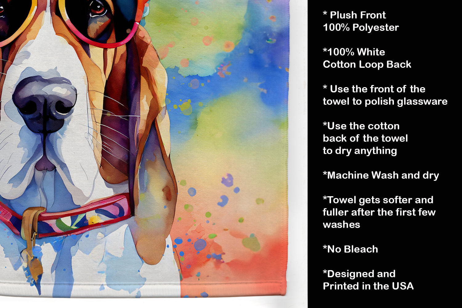 Kitchen Towel featuring breed specific Basset Hound artwork. Experience the perfect blend of aesthetic appeal and functional excellence with our Plush Velour Kitchen Towels. These are not your ordinary decorative kitchen towels that gather dust. Instead, they are designed to be as practical as they are stylish. The front layer of our towel is constructed from a minky plush polyester, known for its durability and color retention. Unlike conventional kitchen towels, the artwork on our towels is dyed directly into the fabric, ensuring vibrant colors that last. Polish your glassware to a brilliant sparkle using the plush front side of the towel. Flip to the back, crafted from 100% cotton terry loop, to exploit its exceptional absorbency for drying dishes or wiping down counters. Our kitchen towels redefine the concept of functional art, offering lasting quality that maintains the towel's shape over time. Measuring 15 inches by 25 inches and weighing 2.3 lbs per dozen, these towels deliver an overwhelming sensory experience with their soft, plush, and smooth texture. The edges are meticulously finished with binding, enhancing their durability and visual appeal. For your convenience, these towels are machine washable and can be dried on low heat. After the first wash, the top fabric becomes even softer and fluffier, eliminating the need for ironing. Treat your kitchen to the luxury and functionality it deserves with our plush velour kitchen towels.