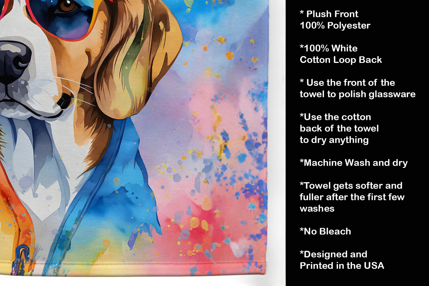 Kitchen Towel featuring breed specific Beagle artwork. Experience the perfect blend of aesthetic appeal and functional excellence with our Plush Velour Kitchen Towels. These are not your ordinary decorative kitchen towels that gather dust. Instead, they are designed to be as practical as they are stylish. The front layer of our towel is constructed from a minky plush polyester, known for its durability and color retention. Unlike conventional kitchen towels, the artwork on our towels is dyed directly into the fabric, ensuring vibrant colors that last. Polish your glassware to a brilliant sparkle using the plush front side of the towel. Flip to the back, crafted from 100% cotton terry loop, to exploit its exceptional absorbency for drying dishes or wiping down counters. Our kitchen towels redefine the concept of functional art, offering lasting quality that maintains the towel's shape over time. Measuring 15 inches by 25 inches and weighing 2.3 lbs per dozen, these towels deliver an overwhelming sensory experience with their soft, plush, and smooth texture. The edges are meticulously finished with binding, enhancing their durability and visual appeal. For your convenience, these towels are machine washable and can be dried on low heat. After the first wash, the top fabric becomes even softer and fluffier, eliminating the need for ironing. Treat your kitchen to the luxury and functionality it deserves with our plush velour kitchen towels.