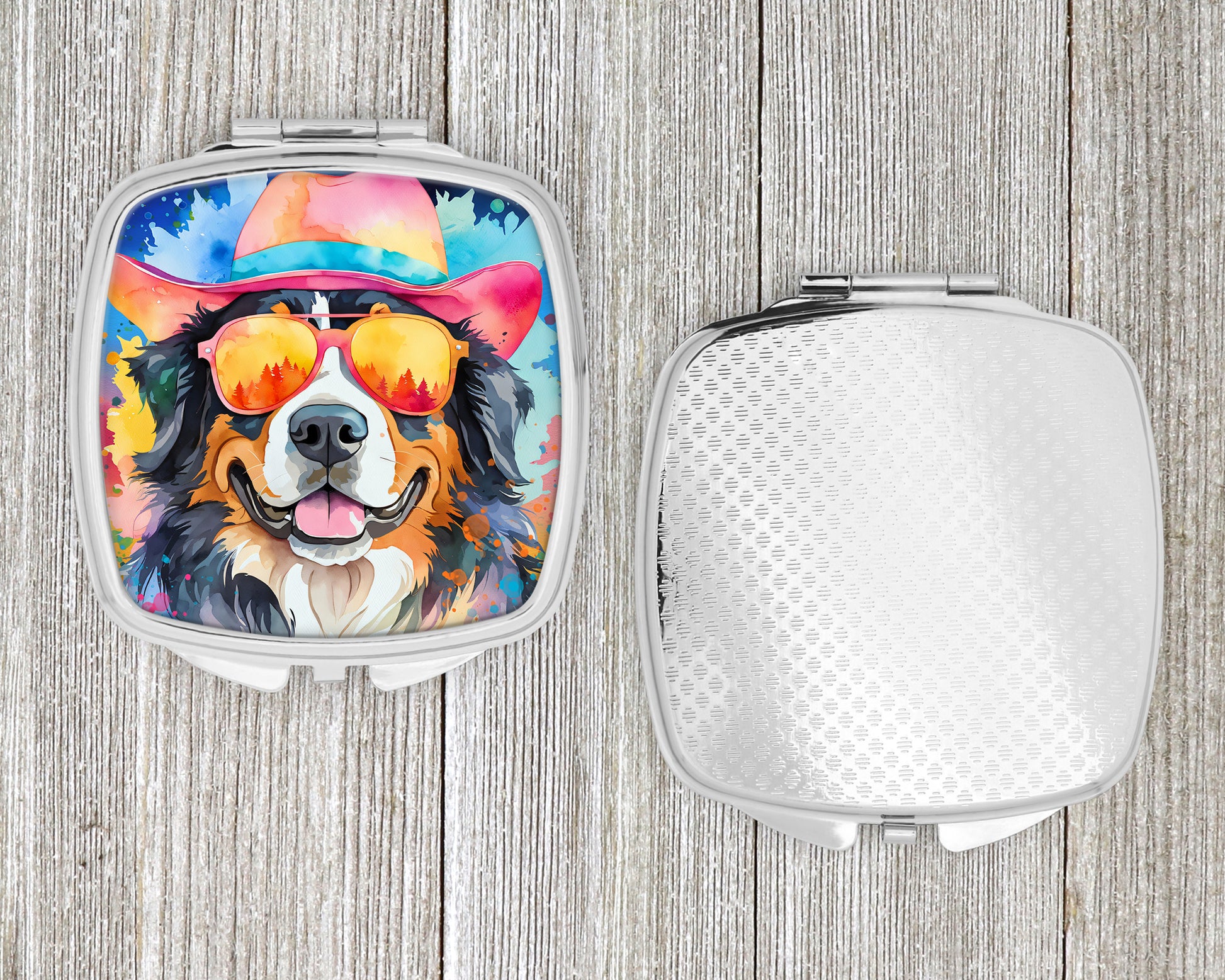 Compact Mirror featuring breed specific Bernese Mountain Dog artwork. Introducing our Square Compact Mirror, a blend of elegance, functionality, and compactness, perfect for on-the-go touch-ups. This Silvertone metal mirror, with dimensions of 2.75 inches x 3 inches x .3 inches, fits effortlessly into your purse, handbag, or pocket, ensuring that you can check your appearance anytime, anywhere. Our compact mirror stands out with its eye-catching artwork on the front, adding a dash of style to this practical accessory. It is more than just a mirror; it's a statement piece that reflects your personality and aesthetic. When opened, this compact reveals two mirrors inside, doubling your perspective for precise touch-ups. The Silvertone metal construction ensures durability while maintaining a lightweight feel, making it an ideal everyday carry item. Whether you're rushing to a meeting, prepping for a dinner date, or just need a quick check on your look, our Square Compact Mirror is your reliable companion. Experience the perfect blend of style and practicality with this must-have accessory.