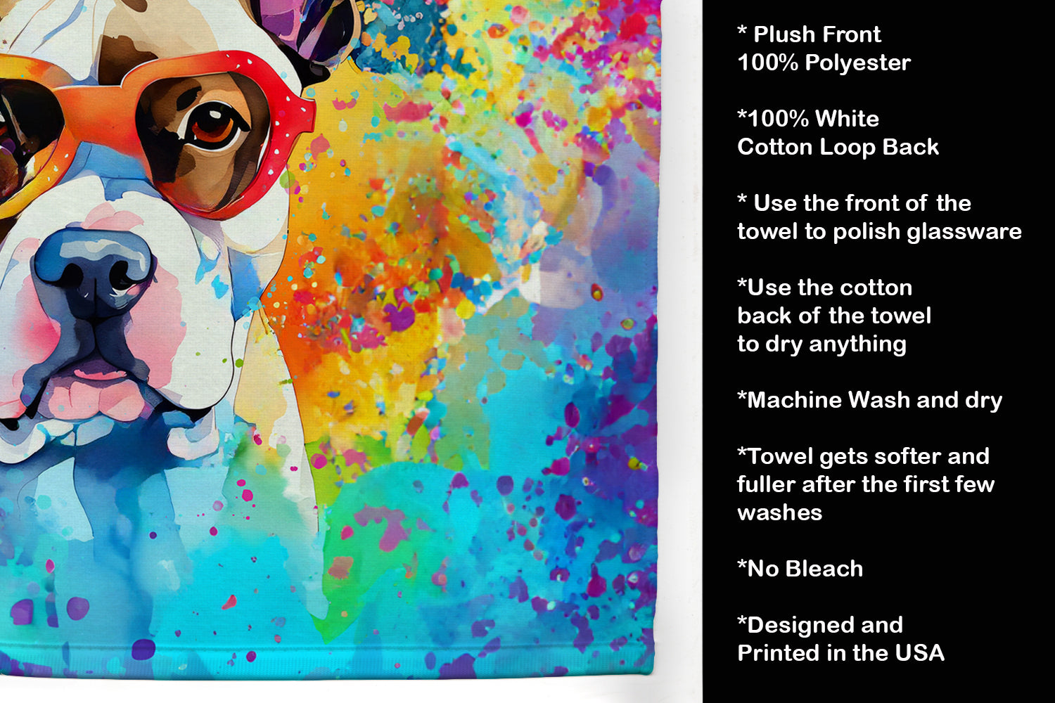 Kitchen Towel featuring breed specific Boxer artwork. Experience the perfect blend of aesthetic appeal and functional excellence with our Plush Velour Kitchen Towels. These are not your ordinary decorative kitchen towels that gather dust. Instead, they are designed to be as practical as they are stylish. The front layer of our towel is constructed from a minky plush polyester, known for its durability and color retention. Unlike conventional kitchen towels, the artwork on our towels is dyed directly into the fabric, ensuring vibrant colors that last. Polish your glassware to a brilliant sparkle using the plush front side of the towel. Flip to the back, crafted from 100% cotton terry loop, to exploit its exceptional absorbency for drying dishes or wiping down counters. Our kitchen towels redefine the concept of functional art, offering lasting quality that maintains the towel's shape over time. Measuring 15 inches by 25 inches and weighing 2.3 lbs per dozen, these towels deliver an overwhelming sensory experience with their soft, plush, and smooth texture. The edges are meticulously finished with binding, enhancing their durability and visual appeal. For your convenience, these towels are machine washable and can be dried on low heat. After the first wash, the top fabric becomes even softer and fluffier, eliminating the need for ironing. Treat your kitchen to the luxury and functionality it deserves with our plush velour kitchen towels.
