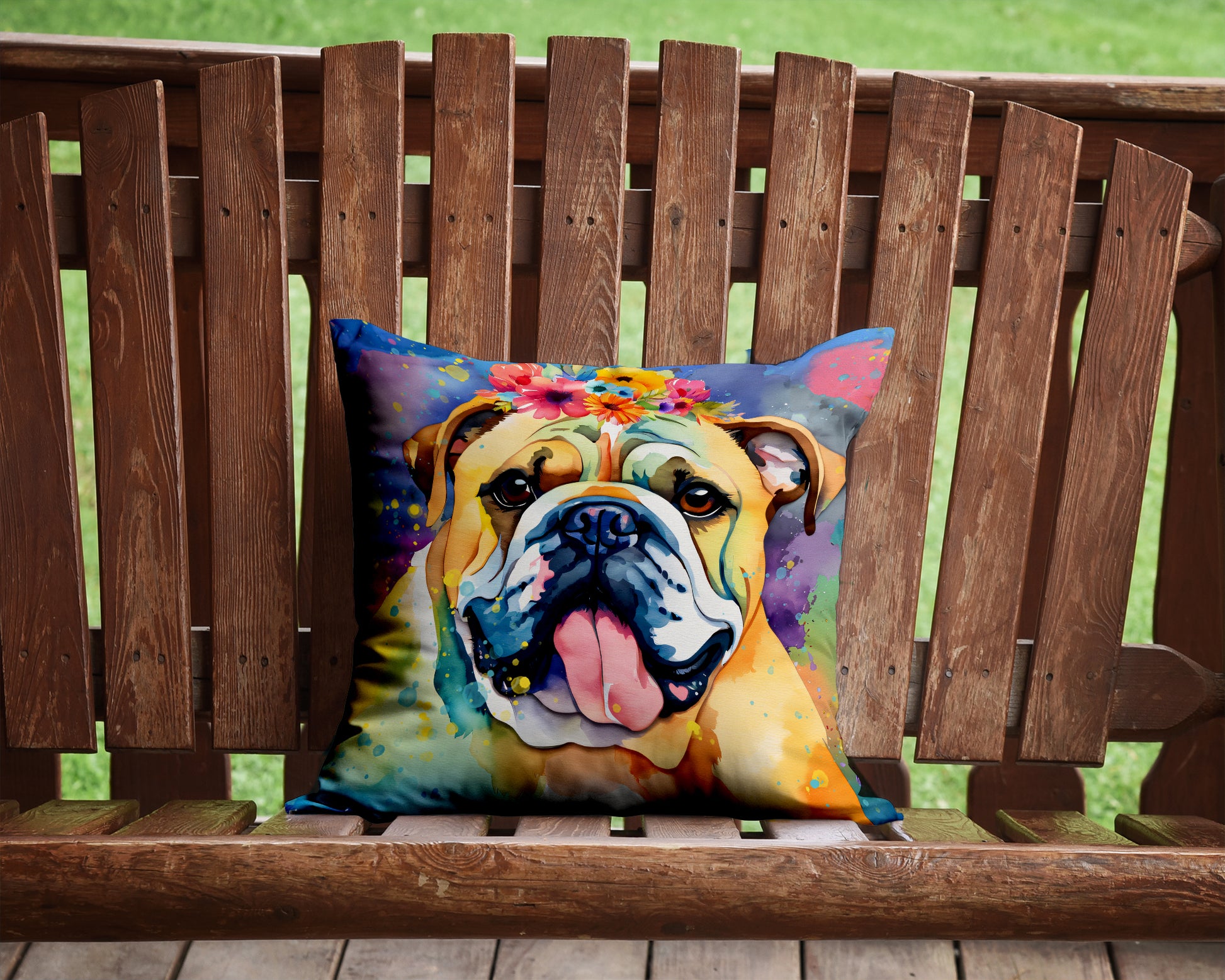 Throw Pillow featuring breed specific English Bulldog artwork. Add a touch of vibrancy and comfort to your outdoor seating with Caroline's Treasures Fabric Decorative Pillow. Measuring approximately 14 inches by 14 inches, this outdoor pillow is crafted to elevate the appeal of your patio furniture, infusing it with vivid color and artistic flair. The pillow includes a 100% Polyester Fabric sham filled with a quality pillow form to provide superior comfort. Innovatively made from our brand new material, specifically woven for its water resistance, this pillow is designed for durability. The soft canvas fabric offers versatility in use, fit for your indoor couch or your outdoor patio, porch, or veranda. The fabric is dyed with colorfast dyes built for resilience against weather conditions, ensuring the pillow retains its beauty over time. Constructed by sewing three fabric pieces to create a sham, the polyester insert is then nestled inside to form the pillow, resulting in an overstuffed pillow that maintains its shape. Both the sham and the pillow insert are proudly made in the United States. As the pillows are handcrafted, there may be minor variations in size, further enhancing their unique charm. Experience comfort in style with Caroline's Treasures Fabric Decorative Pillow.