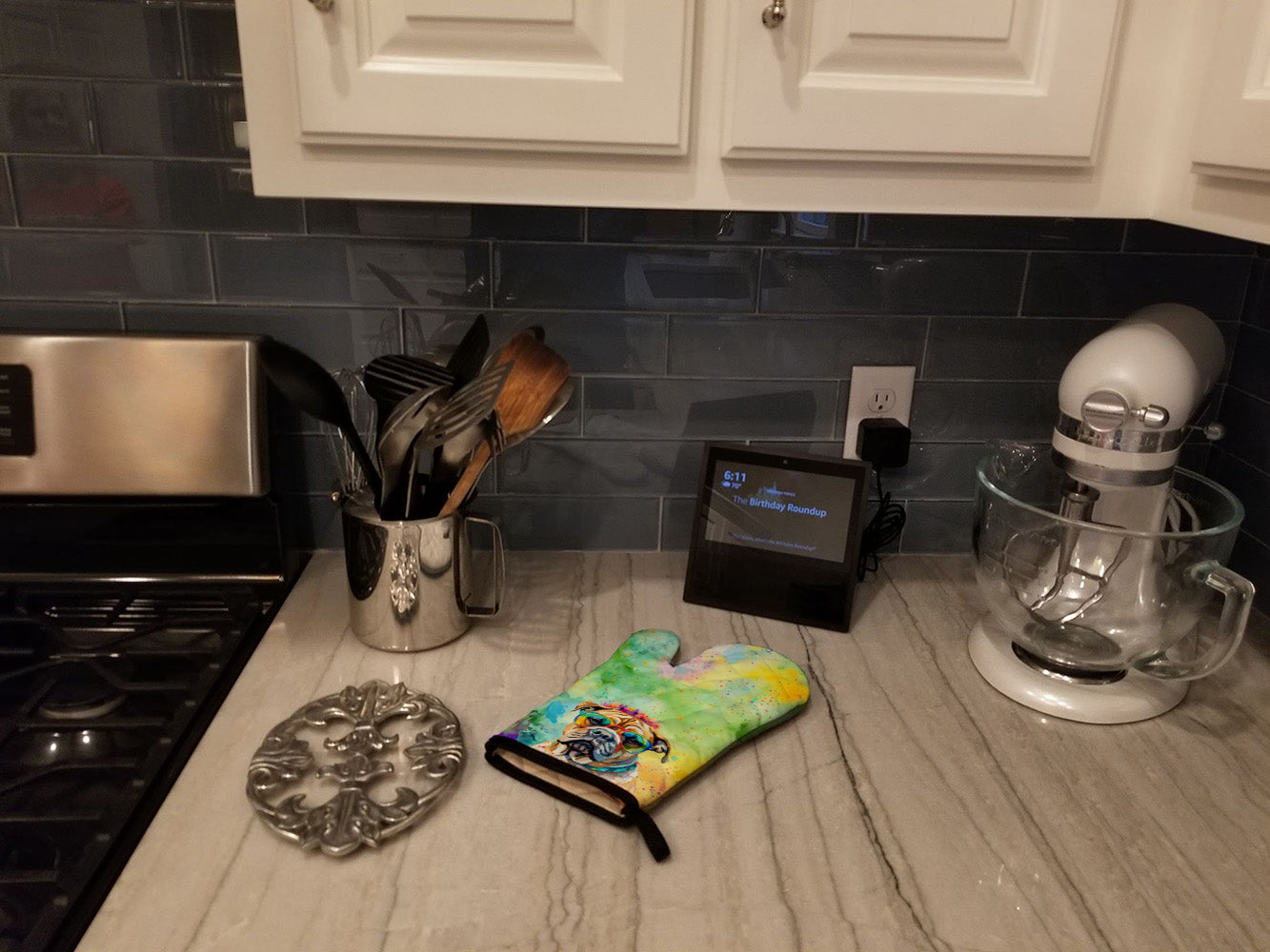 Oven Mitt featuring breed specific Bullmastiff artwork. Presenting our Large Right Hand Thick Heat Resistant Oven Mitt, an indispensable tool for any culinary enthusiast. This mitt boasts layers of quilted protection on both sides, providing outstanding resistance against extreme heat. Embellished with beautifully printed artwork, it adds an extra dash of charm to your kitchen decor. At about 12 inches long and 8 1/2 inches wide, this oven mitt offers a generous fit, accommodating a diverse range of hand sizes. Its design is enhanced by a sleek Black bias tape trim, finished with a convenient hoop for easy hanging. Fresh out of the packaging, the quilting process may give the mitt a stiff feel, but rest assured, it will soften with use and washing. Our mitt is crafted with a unique center fabric, Insul-Bright, a composite material made from polyester fibers, needle-punched through a nonwoven substrate and a reflective metallized film. This smart material resists both conduction and radiant energy, reflecting heat back to its source, all while remaining breathable. Our oven mitt is machine washable and safe for tumble drying. It's a perfect gift for your favorite Chef, BBQ enthusiast, or just a little treat for yourself! Experience safety, style, and convenience rolled into one with this exceptional oven mitt.