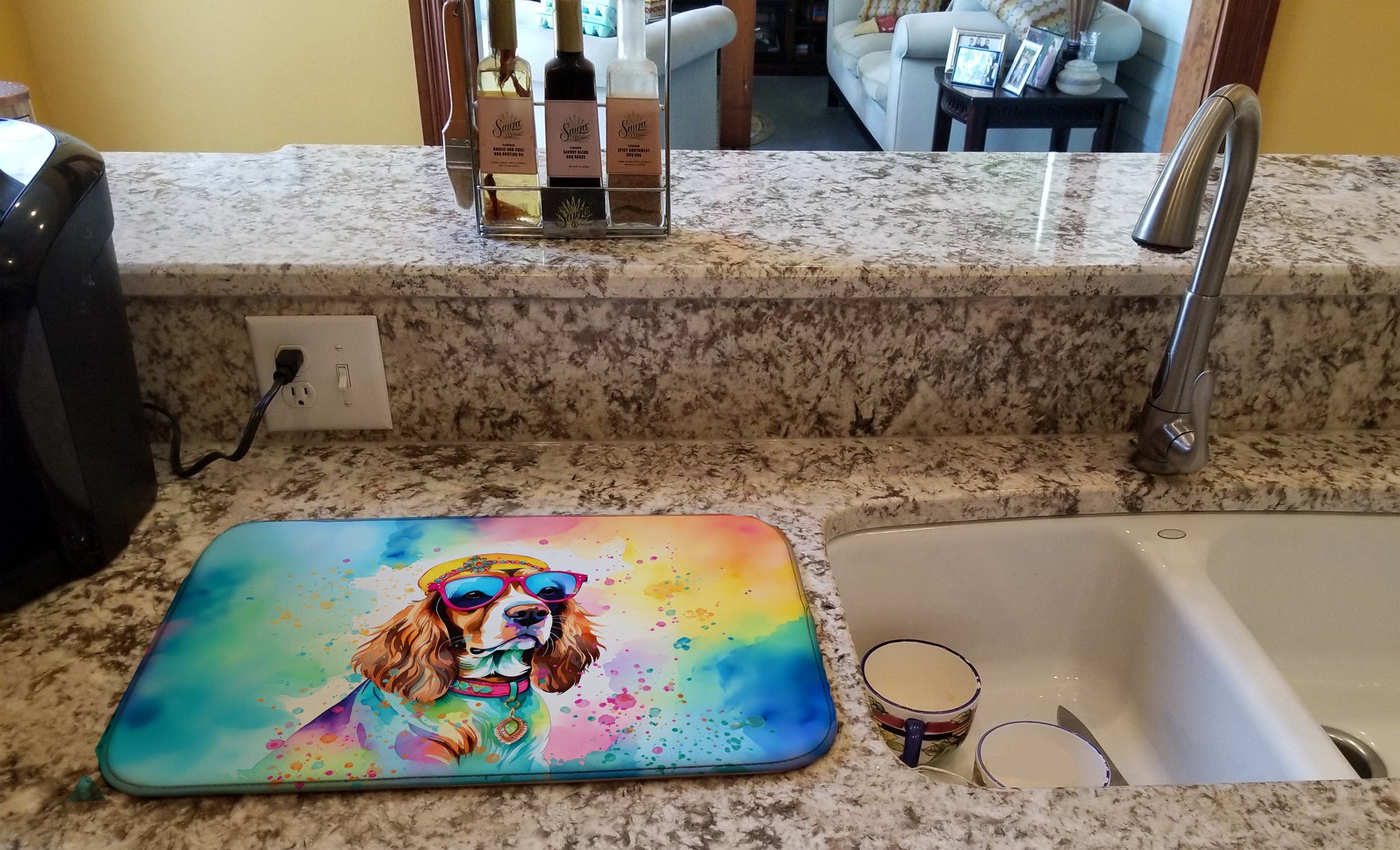 Dish Drying Mat featuring breed specific Cavalier King Charles Spaniel artwork. Say goodbye to messy countertops and soggy dish towels with our innovative dish drying mat. Our high-quality dish drying pad is designed to keep your countertops dry while offering a stylish and efficient solution. Whether you're air drying dishes, glasses, stemware, silverware, pots, pans, bottles, or even fruits and vegetables, our dish mat is the perfect choice. The 14 inches x 22 inches size fits most counters and dish drying racks, and the non-slip design ensures stability. Made with water-absorbent polyester and a polyurethane foam insert, our dish drying mat is not only functional but also durable. It's machine washable and printed in the USA for long-lasting use. The beautiful artwork adds flair to your kitchen decor, making it a perfect housewarming gift or present for any occasion. Upgrade your kitchen experience with our absorbent and versatile dish drying mat.
