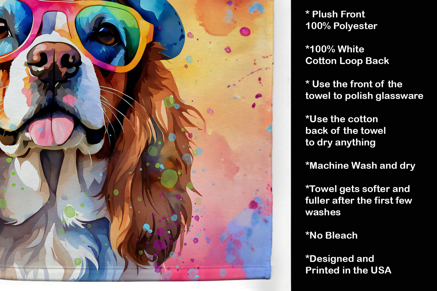 Kitchen Towel featuring breed specific Cavalier King Charles Spaniel artwork. Experience the perfect blend of aesthetic appeal and functional excellence with our Plush Velour Kitchen Towels. These are not your ordinary decorative kitchen towels that gather dust. Instead, they are designed to be as practical as they are stylish. The front layer of our towel is constructed from a minky plush polyester, known for its durability and color retention. Unlike conventional kitchen towels, the artwork on our towels is dyed directly into the fabric, ensuring vibrant colors that last. Polish your glassware to a brilliant sparkle using the plush front side of the towel. Flip to the back, crafted from 100% cotton terry loop, to exploit its exceptional absorbency for drying dishes or wiping down counters. Our kitchen towels redefine the concept of functional art, offering lasting quality that maintains the towel's shape over time. Measuring 15 inches by 25 inches and weighing 2.3 lbs per dozen, these towels deliver an overwhelming sensory experience with their soft, plush, and smooth texture. The edges are meticulously finished with binding, enhancing their durability and visual appeal. For your convenience, these towels are machine washable and can be dried on low heat. After the first wash, the top fabric becomes even softer and fluffier, eliminating the need for ironing. Treat your kitchen to the luxury and functionality it deserves with our plush velour kitchen towels.