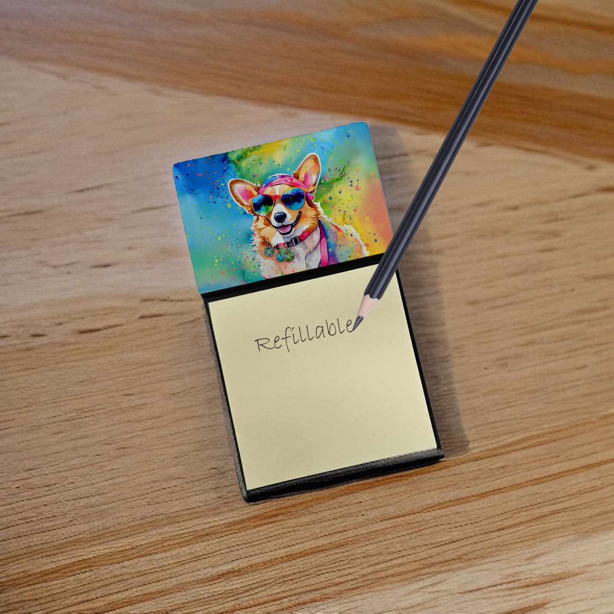 Sticky Note Holder featuring breed specific Corgi artwork. Add a touch of creativity and flair to your desk with the Decorative Sticky Note Holder from Caroline's Treasures. This uniquely designed sticky note dispenser will not only keep your notes in one place but also add an artistic element to your workspace. The top of the holder features beautiful artwork that is sure to catch the eye. Crafted for convenience, this sticky note holder comes with a small pad of 3-inch x 3-inch sticky notes at the bottom. The holder is designed for easy refilling; simply remove the last sheet of a new sticky note pad and stick it onto the board. This feature ensures you will always have sticky notes at your disposal. This Sticky Note Holder makes a perfect gift. Be it for your colleagues at work, your Facebook friends, or even your dog groomer or hairdresser, this versatile product fits the bill. You can use it for making grocery lists, leaving notes for loved ones, or for jotting down important reminders. The bottom board is rigid and can be magnetized by adding a business card size magnet to the back (sold separately). This makes it even more versatile, allowing you to place it on a refrigerator or any other magnetic surface. With this Sticky Note Holder, you're not only organizing your notes, but also personalizing your space.