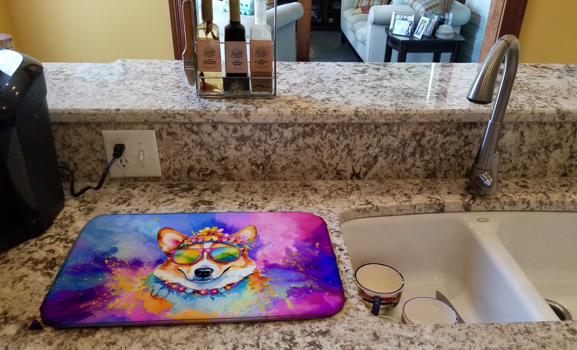 Dish Drying Mat featuring breed specific Corgi artwork. Say goodbye to messy countertops and soggy dish towels with our innovative dish drying mat. Our high-quality dish drying pad is designed to keep your countertops dry while offering a stylish and efficient solution. Whether you're air drying dishes, glasses, stemware, silverware, pots, pans, bottles, or even fruits and vegetables, our dish mat is the perfect choice. The 14 inches x 22 inches size fits most counters and dish drying racks, and the non-slip design ensures stability. Made with water-absorbent polyester and a polyurethane foam insert, our dish drying mat is not only functional but also durable. It's machine washable and printed in the USA for long-lasting use. The beautiful artwork adds flair to your kitchen decor, making it a perfect housewarming gift or present for any occasion. Upgrade your kitchen experience with our absorbent and versatile dish drying mat.