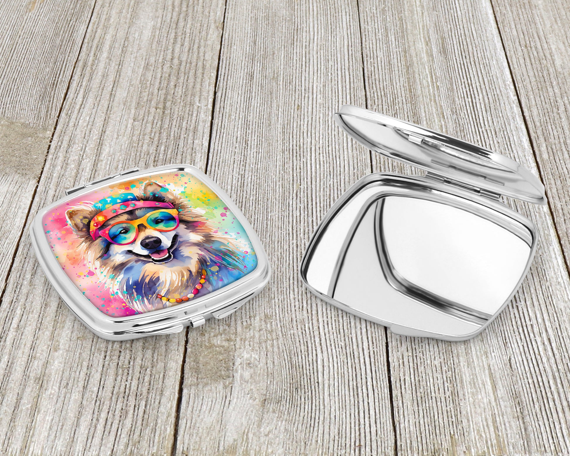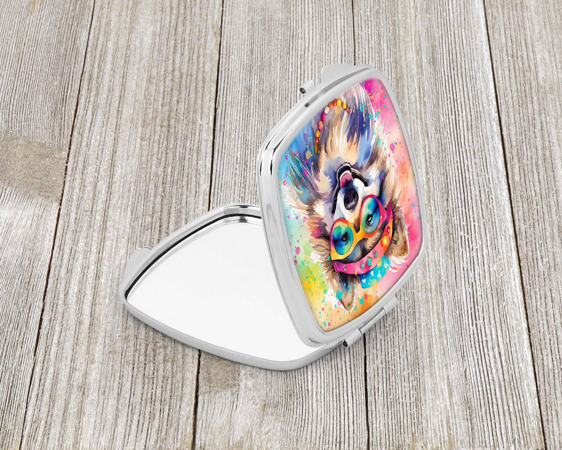 Compact Mirror featuring breed specific Keeshond artwork. Introducing our Square Compact Mirror, a blend of elegance, functionality, and compactness, perfect for on-the-go touch-ups. This Silvertone metal mirror, with dimensions of 2.75 inches x 3 inches x .3 inches, fits effortlessly into your purse, handbag, or pocket, ensuring that you can check your appearance anytime, anywhere. Our compact mirror stands out with its eye-catching artwork on the front, adding a dash of style to this practical accessory. It is more than just a mirror; it's a statement piece that reflects your personality and aesthetic. When opened, this compact reveals two mirrors inside, doubling your perspective for precise touch-ups. The Silvertone metal construction ensures durability while maintaining a lightweight feel, making it an ideal everyday carry item. Whether you're rushing to a meeting, prepping for a dinner date, or just need a quick check on your look, our Square Compact Mirror is your reliable companion. Experience the perfect blend of style and practicality with this must-have accessory.