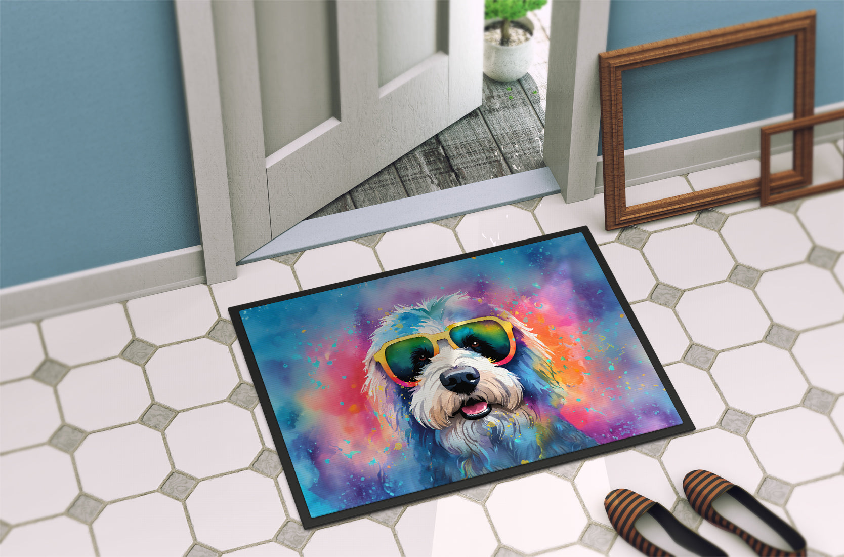 Doormat featuring breed specific Old English Sheepdog artwork. Welcome your guests in style with our Artwork Door Mat, designed to withstand almost any weather condition. This mat, measuring approximately 18 by 27 inches, is held together by durable black binding tape. Its top layer, composed of polyester felt, is dyed with the eye-catching image you see on the mat. A few layers below provide the mat with stability, while its rubber bottom is stamped to help prevent slipping and ensures safety. Our mat works wonderfully as both an indoor or outdoor door mat. For cleaning, simply hose it off with water or use a power washer - no need for any cleaner that produces suds. Avoid scrubbing with a brush, instead, opt for the vacuum on floor setting. Designed manufactured and printed in the USA, this mat is a perfect addition to your porch, outdoor kitchen, entryway, or any indoor space. Its unique design makes it a charming decorative rug that greets your guests and adds a stylish touch to your home decor.
