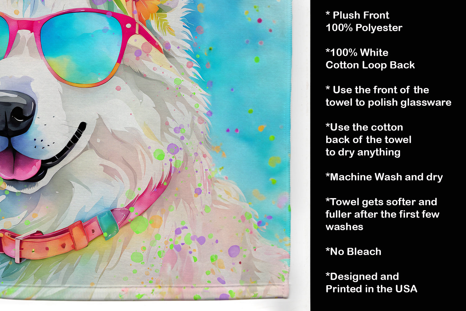 Kitchen Towel featuring breed specific Samoyed artwork. Experience the perfect blend of aesthetic appeal and functional excellence with our Plush Velour Kitchen Towels. These are not your ordinary decorative kitchen towels that gather dust. Instead, they are designed to be as practical as they are stylish. The front layer of our towel is constructed from a minky plush polyester, known for its durability and color retention. Unlike conventional kitchen towels, the artwork on our towels is dyed directly into the fabric, ensuring vibrant colors that last. Polish your glassware to a brilliant sparkle using the plush front side of the towel. Flip to the back, crafted from 100% cotton terry loop, to exploit its exceptional absorbency for drying dishes or wiping down counters. Our kitchen towels redefine the concept of functional art, offering lasting quality that maintains the towel's shape over time. Measuring 15 inches by 25 inches and weighing 2.3 lbs per dozen, these towels deliver an overwhelming sensory experience with their soft, plush, and smooth texture. The edges are meticulously finished with binding, enhancing their durability and visual appeal. For your convenience, these towels are machine washable and can be dried on low heat. After the first wash, the top fabric becomes even softer and fluffier, eliminating the need for ironing. Treat your kitchen to the luxury and functionality it deserves with our plush velour kitchen towels.